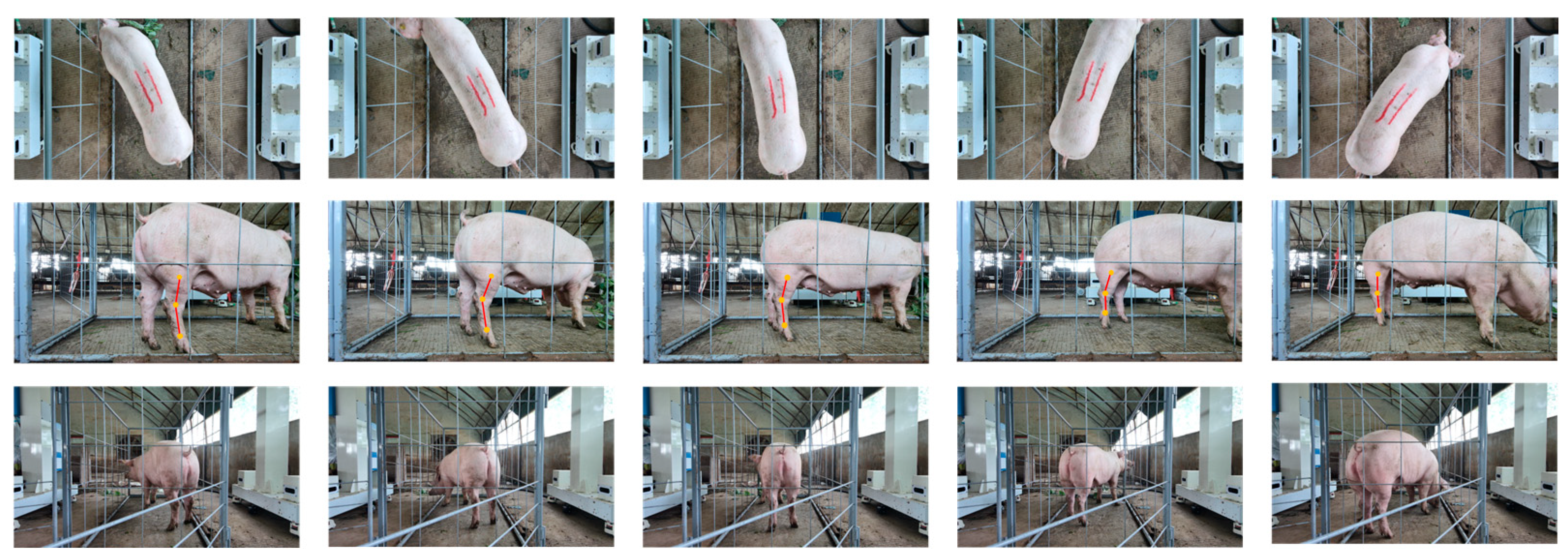 Figure 14). In practical on-farm acquisition, pigs do not maintain a fixed posture for long periods in the pen, and it is often difficult to obtain ideal sagittal-view and coronal-view RGB images at the desired angles. As a result, the bending angle computed for the same leg can vary under different shooting angles, which reduces scoring accuracy (
