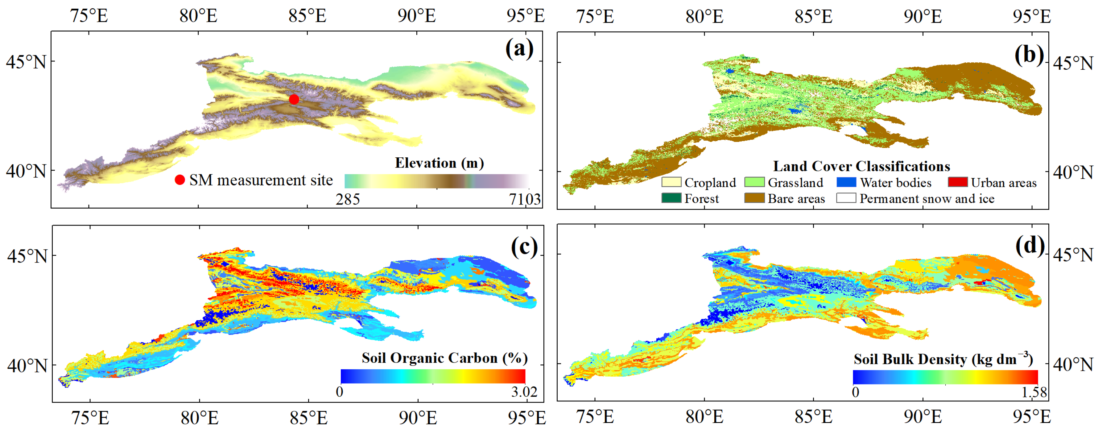 | Soil bulk density (BULK), Soil organic carbon content (SOC) | HWSD | 1 km × 1 km | - | https://www.fao.org/home/en/ (accessed on 17 January 2024) | [60] |