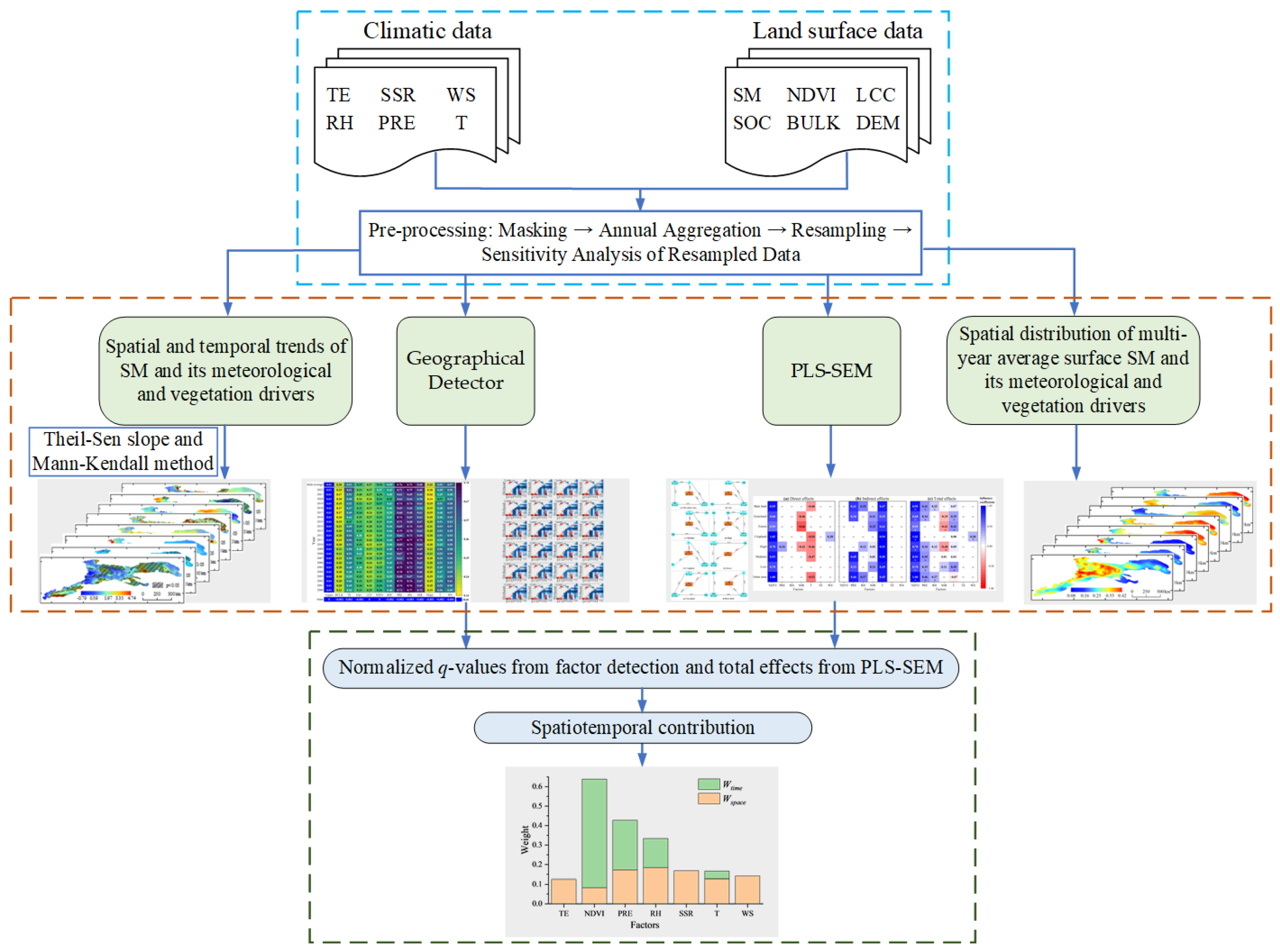 - NDVI and PRE were the primary environmental drivers of surface SM spatiotemporal dynamics, followed by RH, SSR, T, TE, and WS. NDVI and PRE mainly impacted the temporal dynamics of surface SM, while SSR, T, TE and WS primarily affected its spatial patterns. These findings suggest that soil moisture can be enhanced through ecological and water resources management.