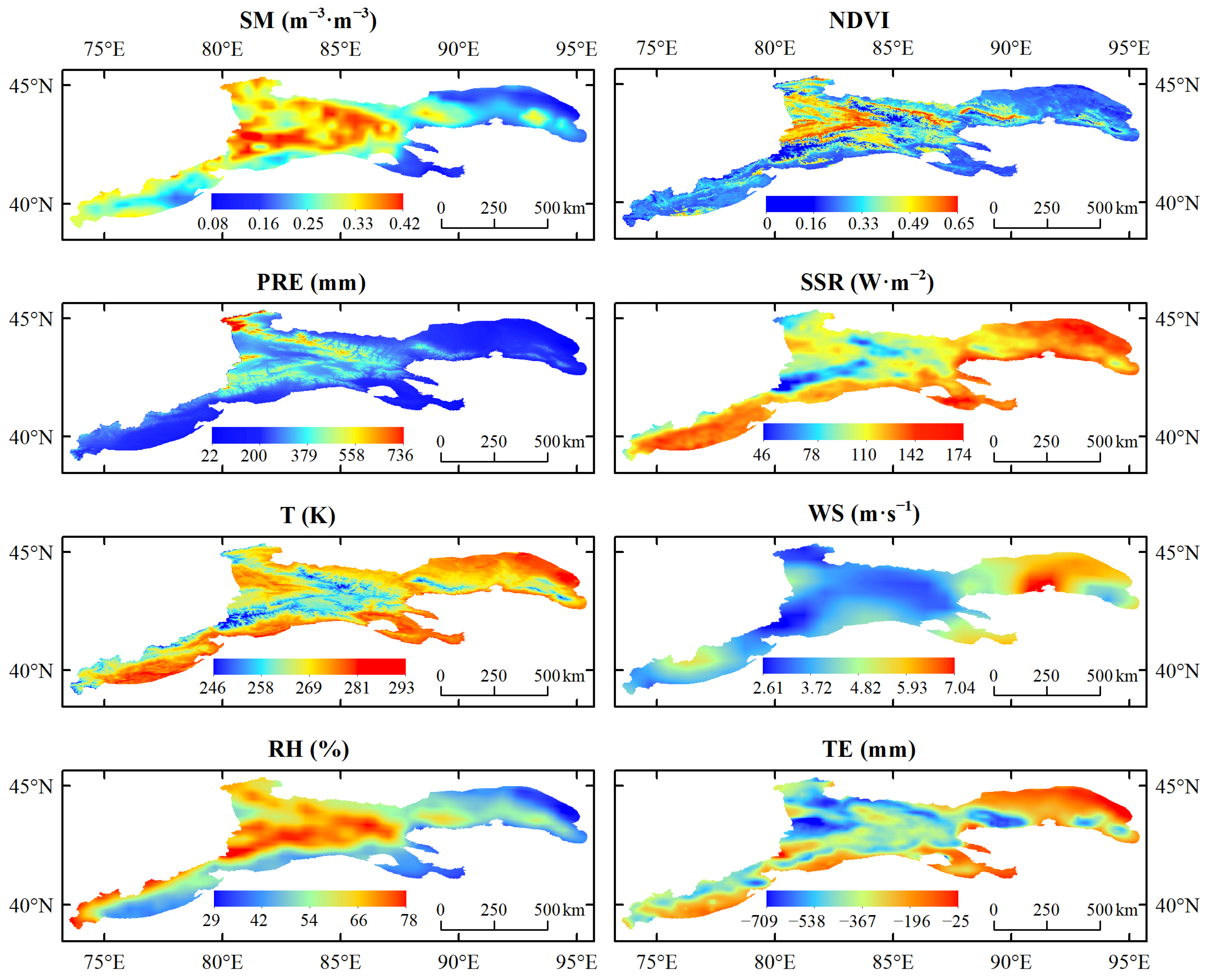 - The individual effects of RH, PRE, SSR, WS, TE and T on the spatial variability of surface SM were greater than those of other factors, particularly RH, PRE, SSR. The interactive effects of these three factors with other factors were also strong, particularly the interaction between RH/PRE and WS, implying that WS regulates the surface SM spatial pattern via its influence on land–atmosphere water exchange. The spatial sensitivity of SM to RH and PRE increased with their values, but 316 mm was the upper threshold in terms of SM response to annual PRE. SM was highly sensitive to both RH and PRE in the central TS.