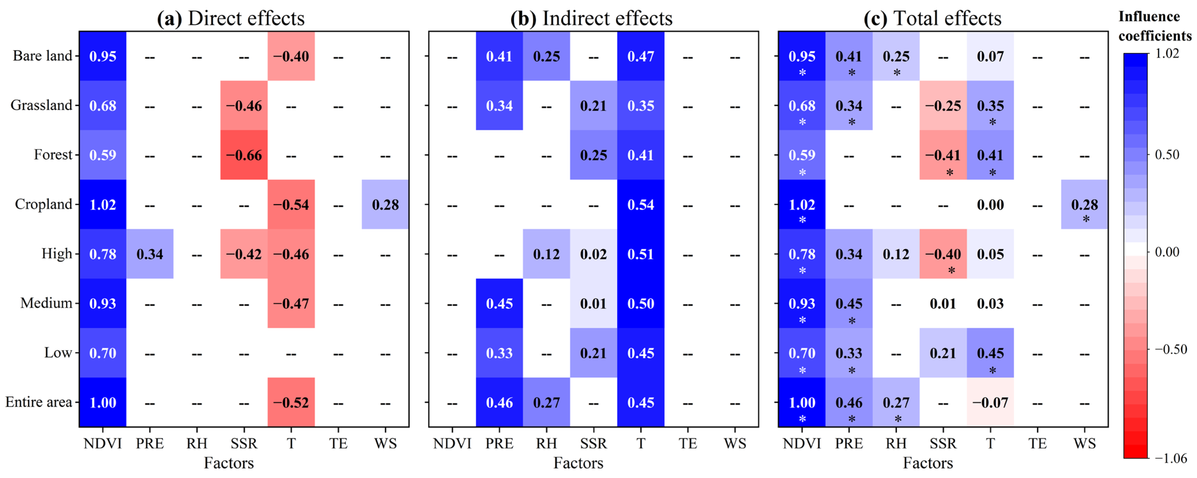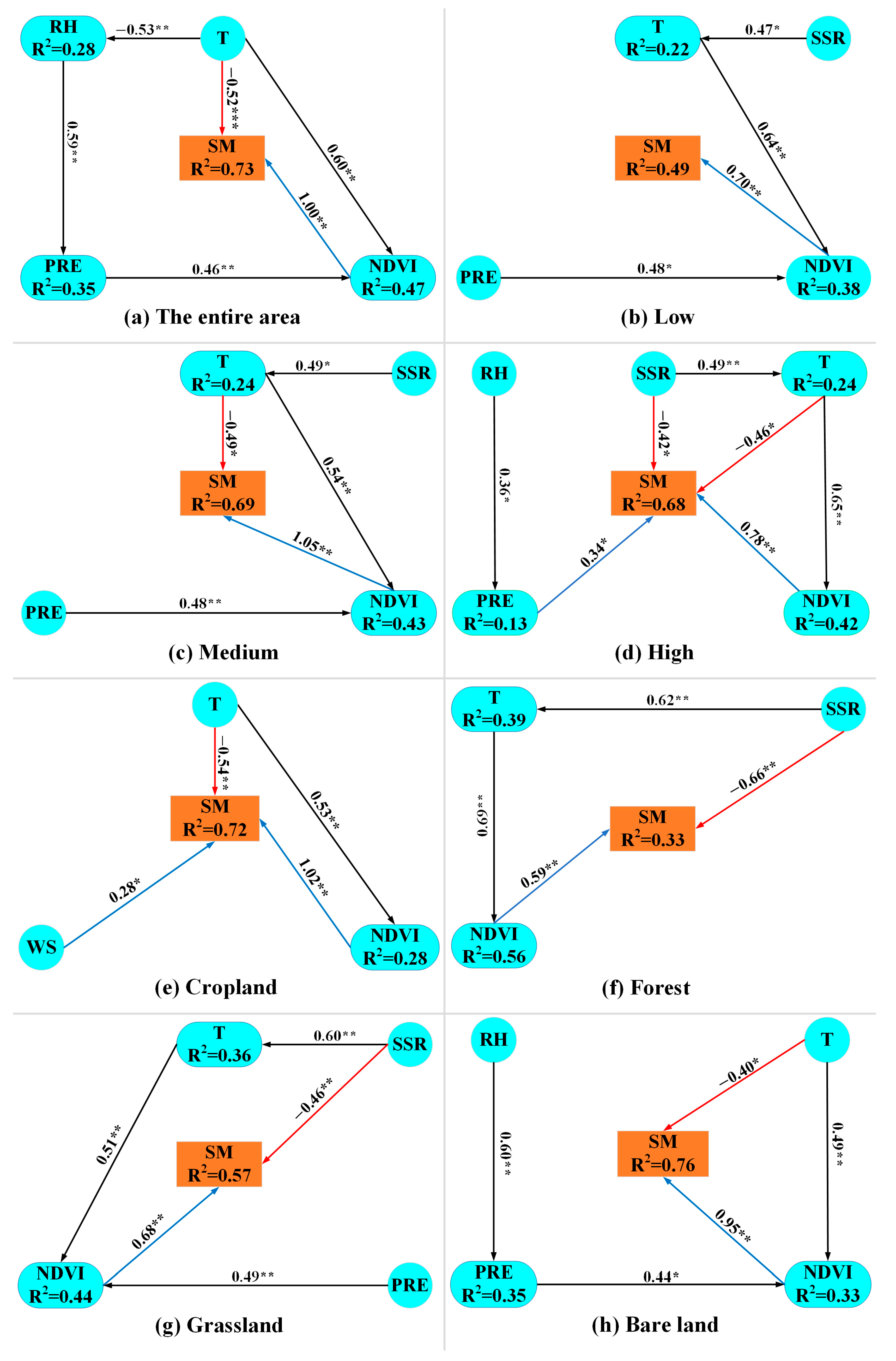 - NDVI exerted the most pronounced positive direct effect on surface SM dynamics, while PRE mainly exerted an indirect positive effect by promoting vegetation greenness. In contrast, T showed a negative direct effect on surface SM, which was offset by its positive indirect effect via vegetation greenness, highlighting the importance of vegetation–climate feedbacks in regulating SM dynamics. SSR influenced annual surface SM dynamics mainly via T, while RH influenced it via PRE. Notably, WS exerted a significant direct effect on surface SM only in cropland.