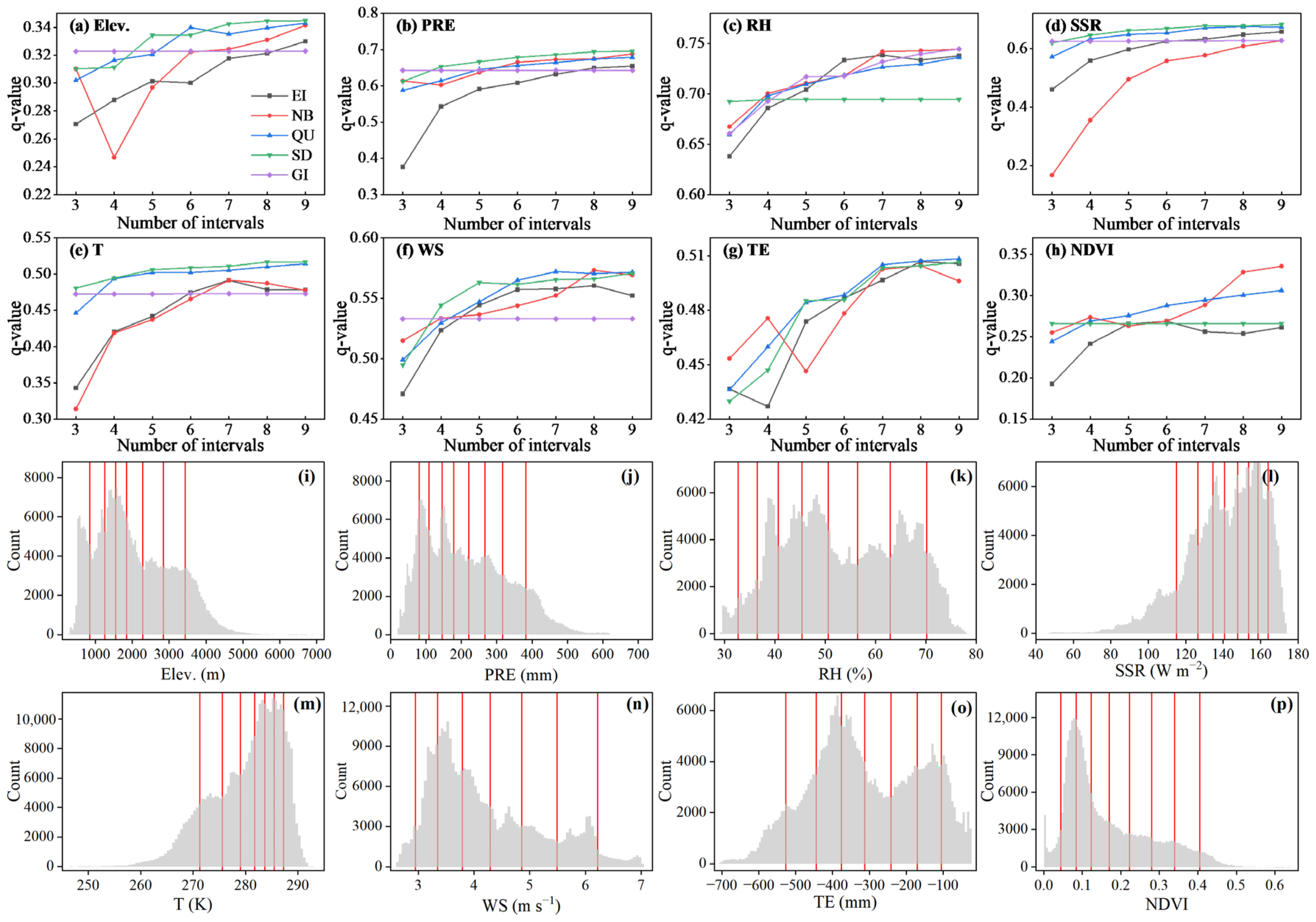 | Variable | Elev. (m) | PRE (mm) | RH (%) | SSR (W·m−2) | T (K) | WS (m·s−1) | TE (mm) | NDVI |