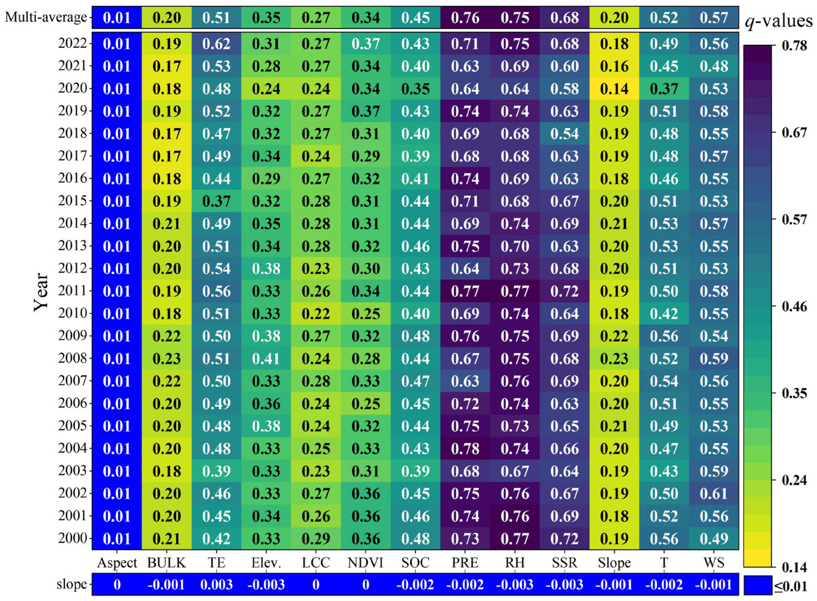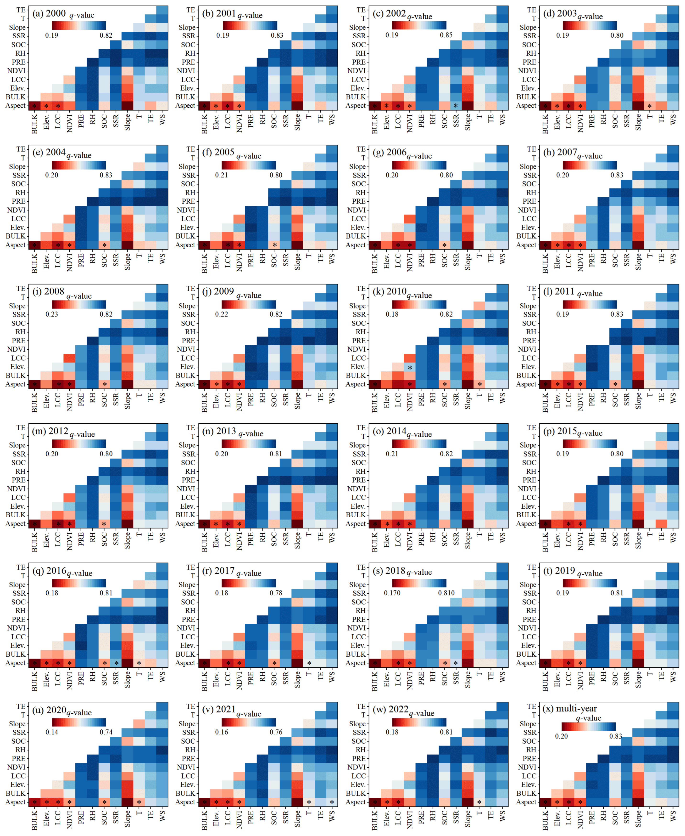 | Year | Elev. | PRE | RH | SSR | T | WS | TE | NDVI |