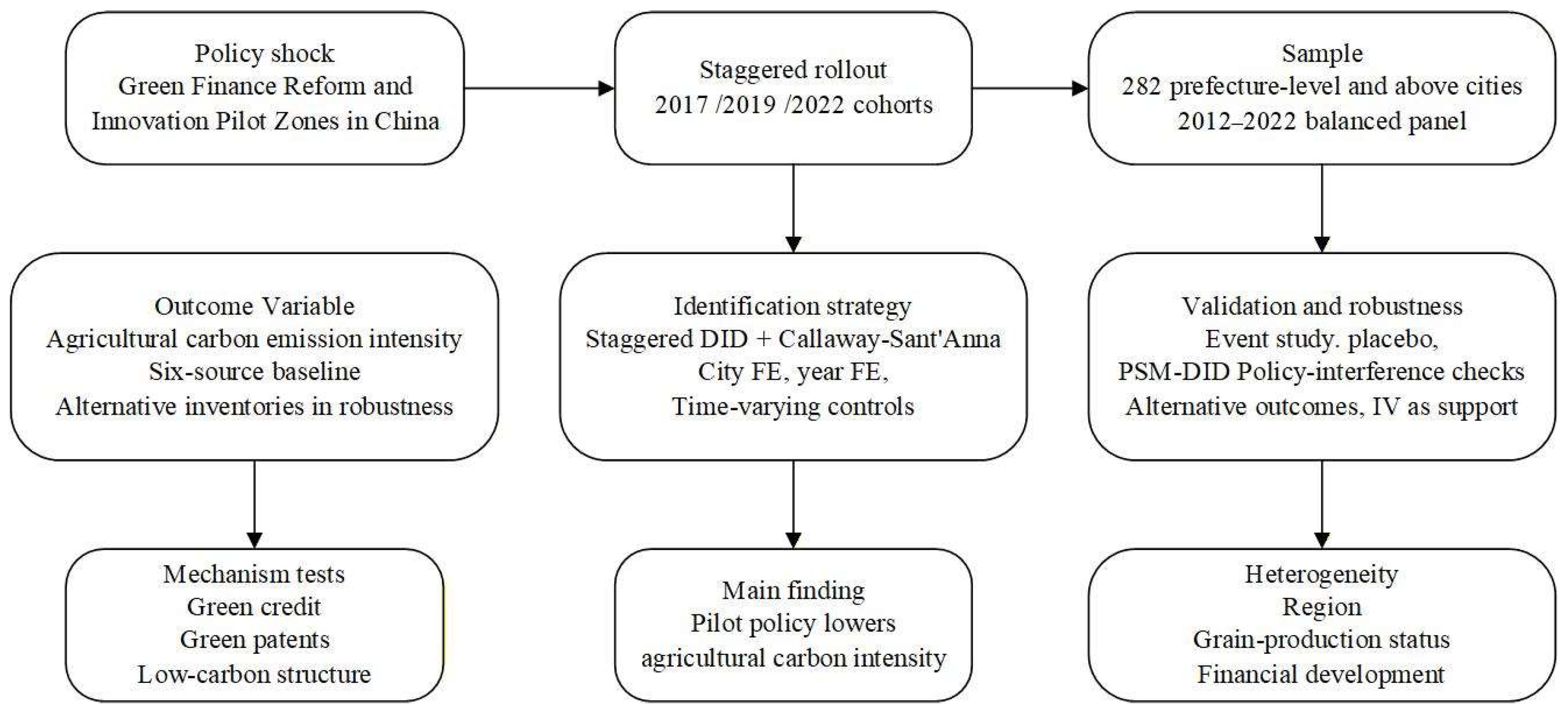 11]. The sectoral focus therefore extends the literature from urban and industrial decarbonization to decentralized agricultural decarbonization. Second, beyond estimating an average policy effect, this paper develops an agriculture-specific transmission framework in which green finance affects carbon intensity through three complementary channels: directed credit allocation, green technology adoption, and production-structure adjustment. The theoretical contribution lies in clarifying why these channels should interact more strongly in agriculture than in sectors with concentrated emitters and easier environmental monitoring. Third, methodologically, the paper combines staggered DID estimation with the Callaway and Sant’Anna estimator and a series of robustness checks. Furthermore, it explicitly positions the instrumental-variable results and mechanism regressions as supplementary evidence, maintaining an appropriately bounded causal interpretation. Fourth, at the policy level, the study’s heterogeneity analysis provides precise empirical references for formulating differentiated green finance policies.