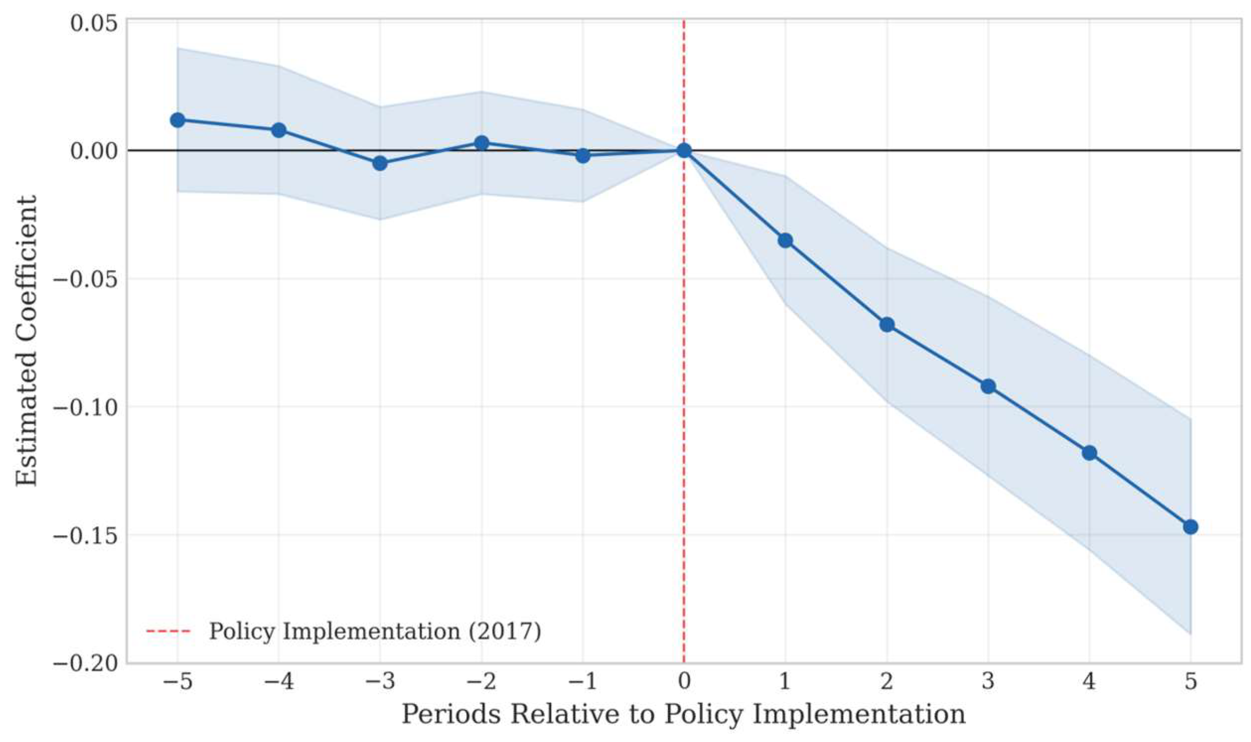 The core assumption for the validity of the difference-in-differences approach is that the treatment and control groups exhibit parallel trends prior to policy implementation. This study tests this assumption using an event study methodology, with the following specification: