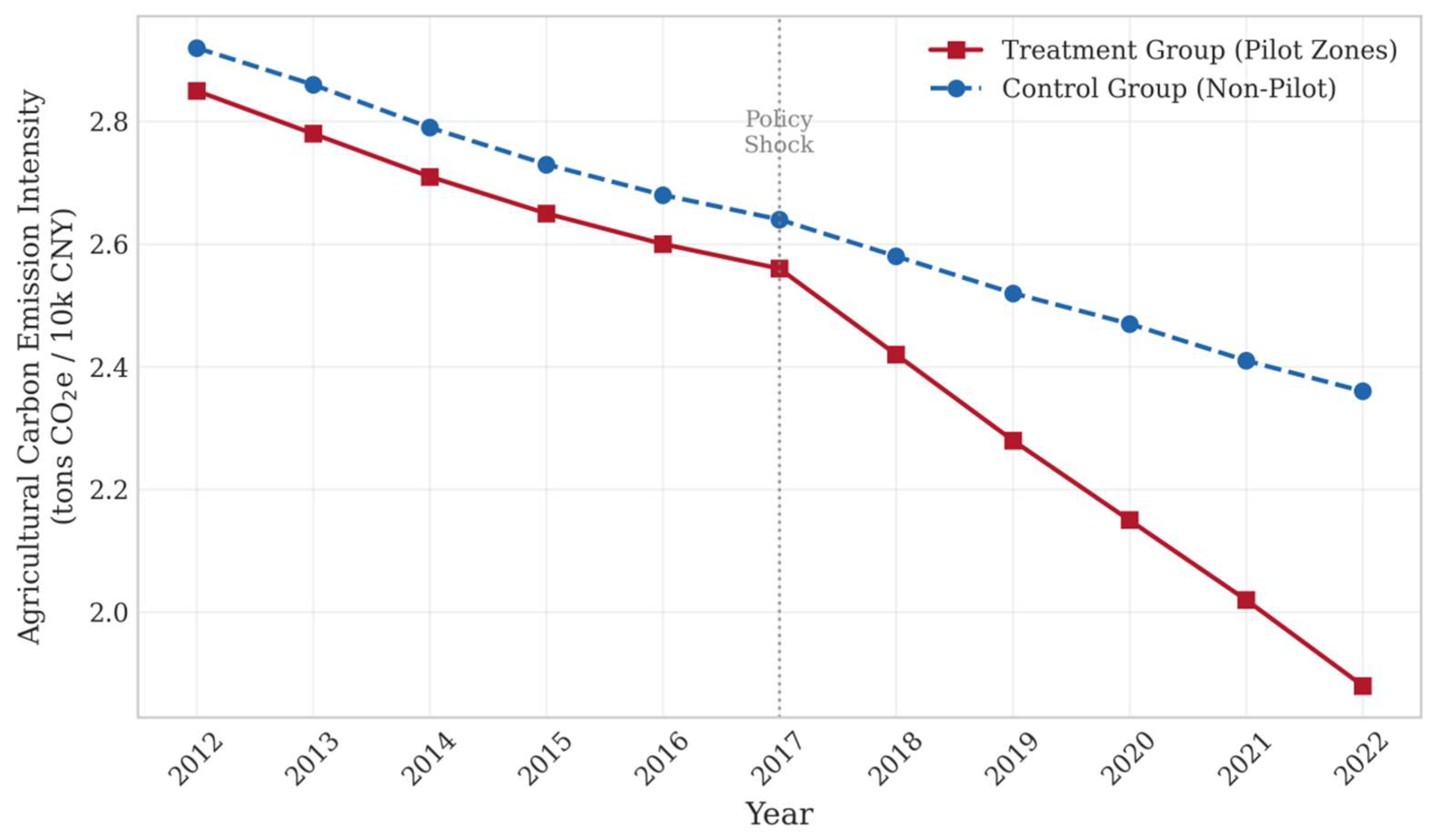17]. However, much of this literature remains descriptive or correlational. It tells us which factors co-move with agricultural carbon emissions, but it offers less evidence on whether a policy-induced financial shock can causally change agricultural production behavior [
