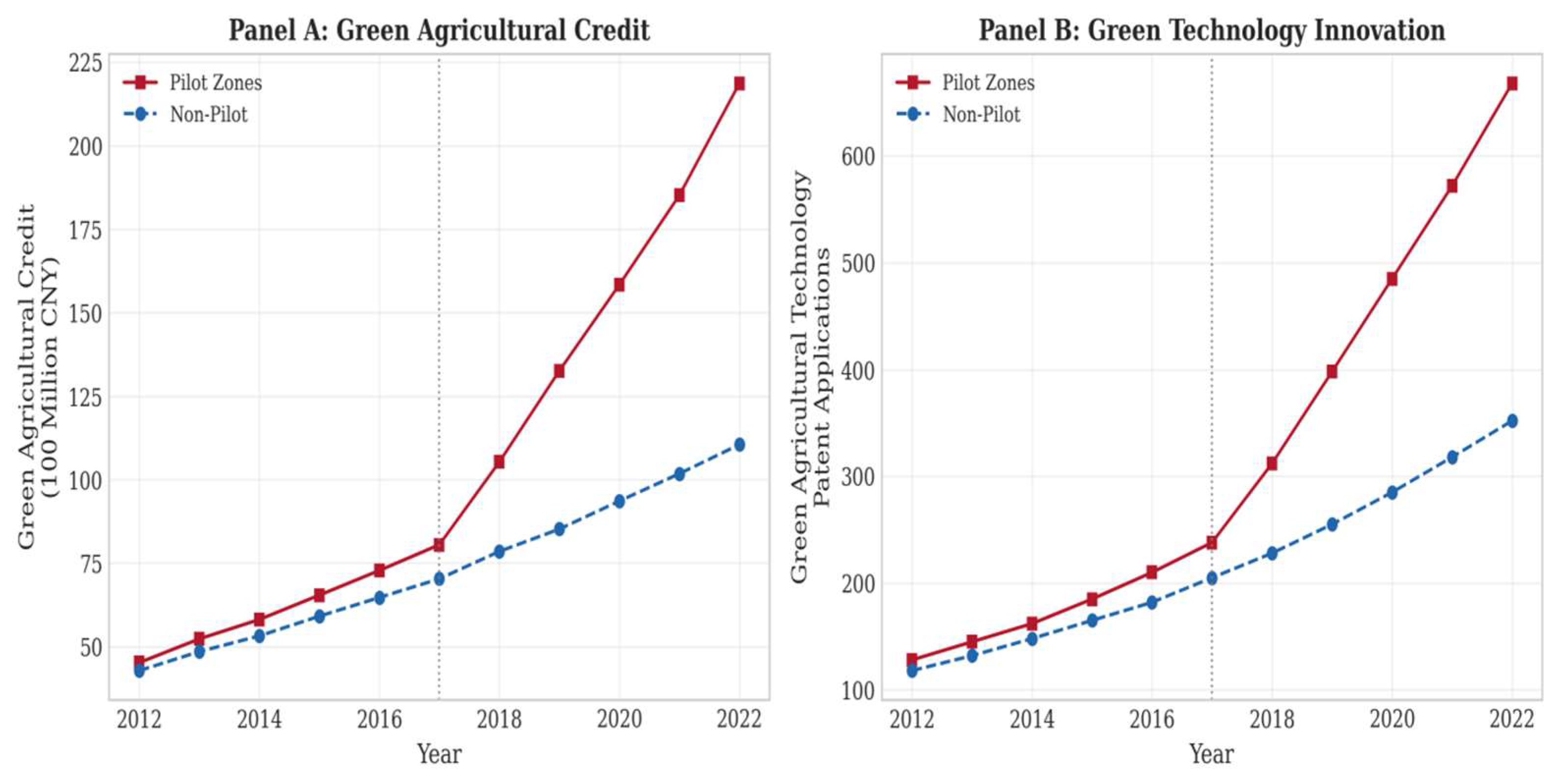 The core policy elements of the pilot zones include: first, refining the green finance organizational framework by encouraging financial institutions to establish dedicated green finance divisions or specialized entities; second, innovating green financial products and services through the development of green credit, green bonds, green insurance, and green funds; third, broadening financing channels for green industries by supporting eligible green enterprises in listing and refinancing; and fourth, establishing robust green finance risk prevention mechanisms alongside enhanced environmental information disclosure systems. Within the agricultural sector, pilot zone policies manifest specifically through increased credit support for ecological and organic agriculture; innovation in financial products such as agricultural carbon sink mortgage loans and green agricultural insurance; and the establishment of an agricultural green development evaluation system.