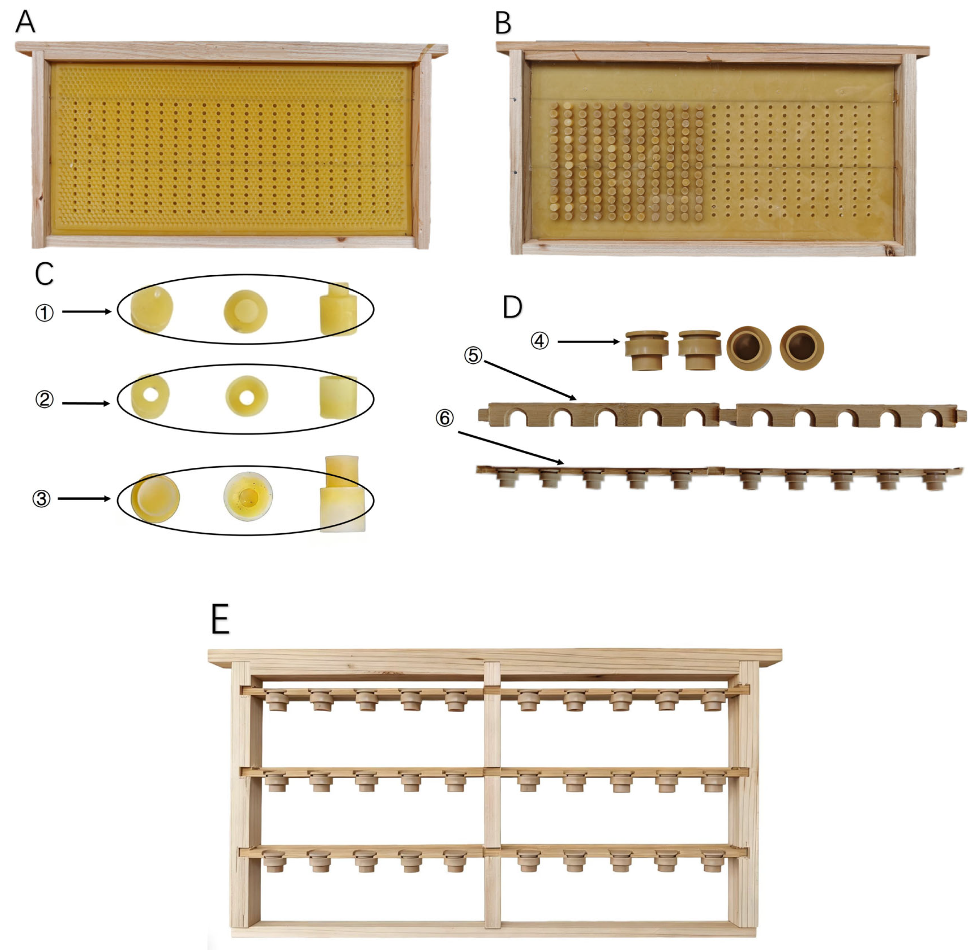 2.2. Structure and Main Accessories of the Beeswax-Based Tools for Queen Rearing Without Grafting Larvae