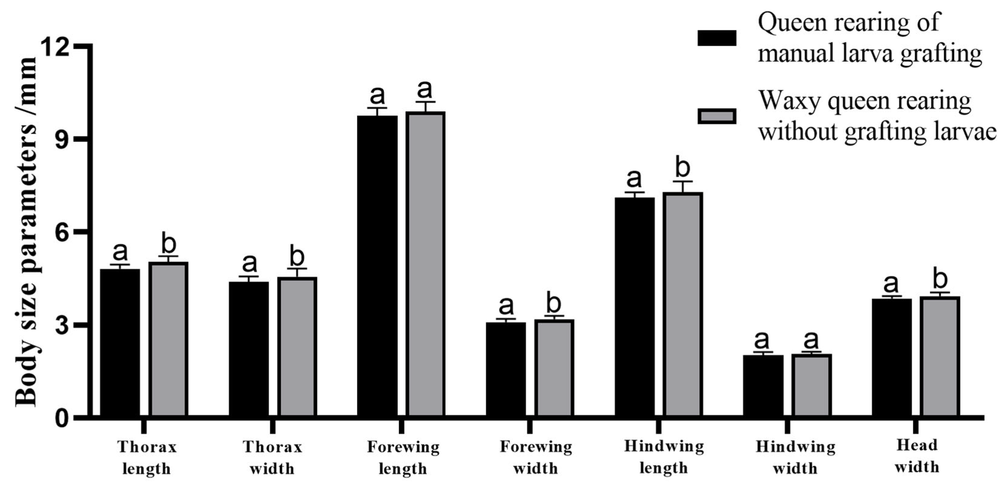 | Queen rearing of manual larva grafting (control group) | 86.11 ± 6.81 a | 91.67 ± 7.46 a | 27.47 ± 3.46 b |