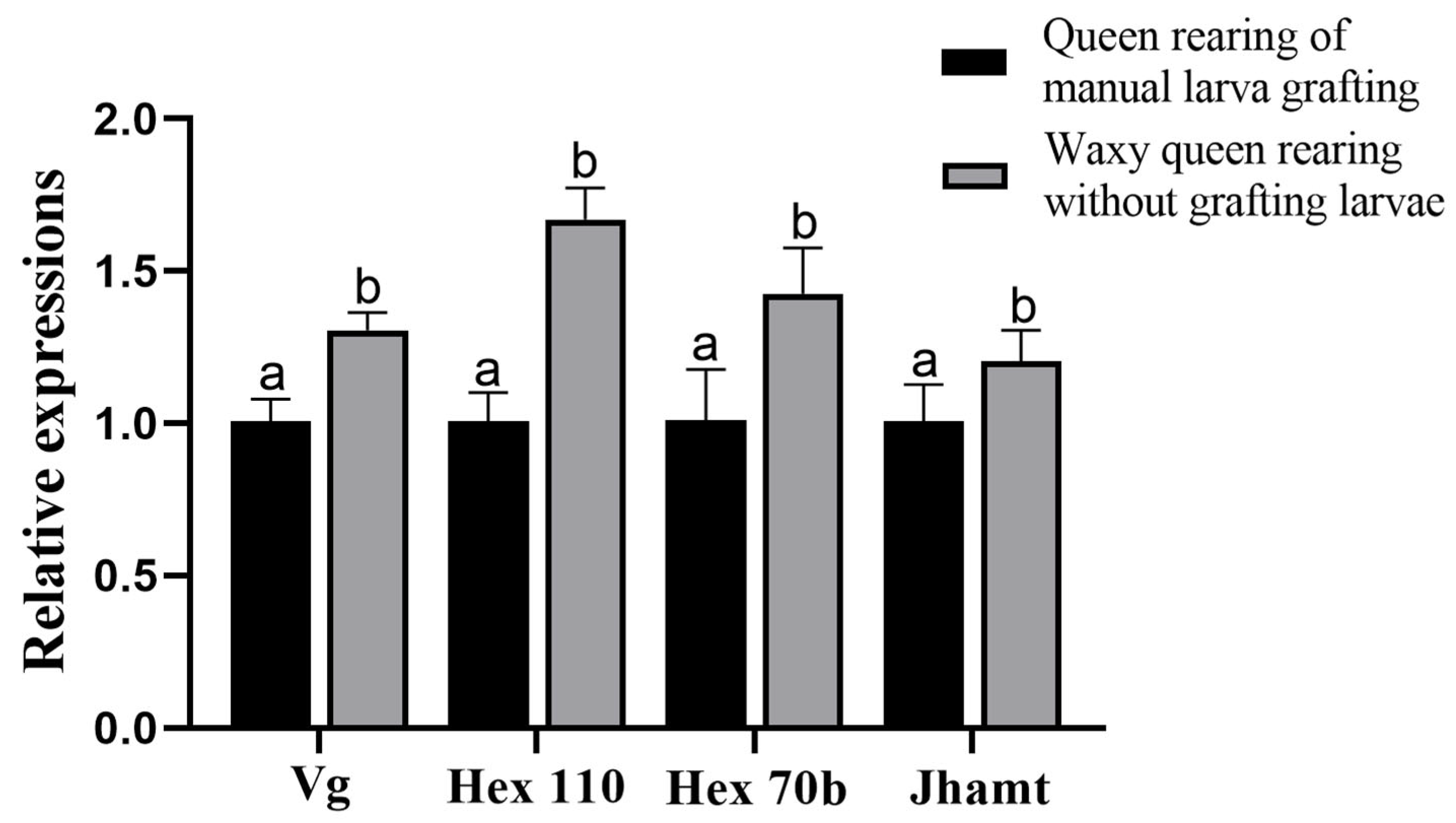 - Pang, Q.; Wang, Y.; Wang, K.; Zhang, W.W.; Ji, T. Differential Expression Analysis of hexamerin110 and hexamerin70b in Queen Bee Ovaries at Different Larval Grafting Ages. J. Environ. Entomol. 2017, 39, 62–67. [Google Scholar]
