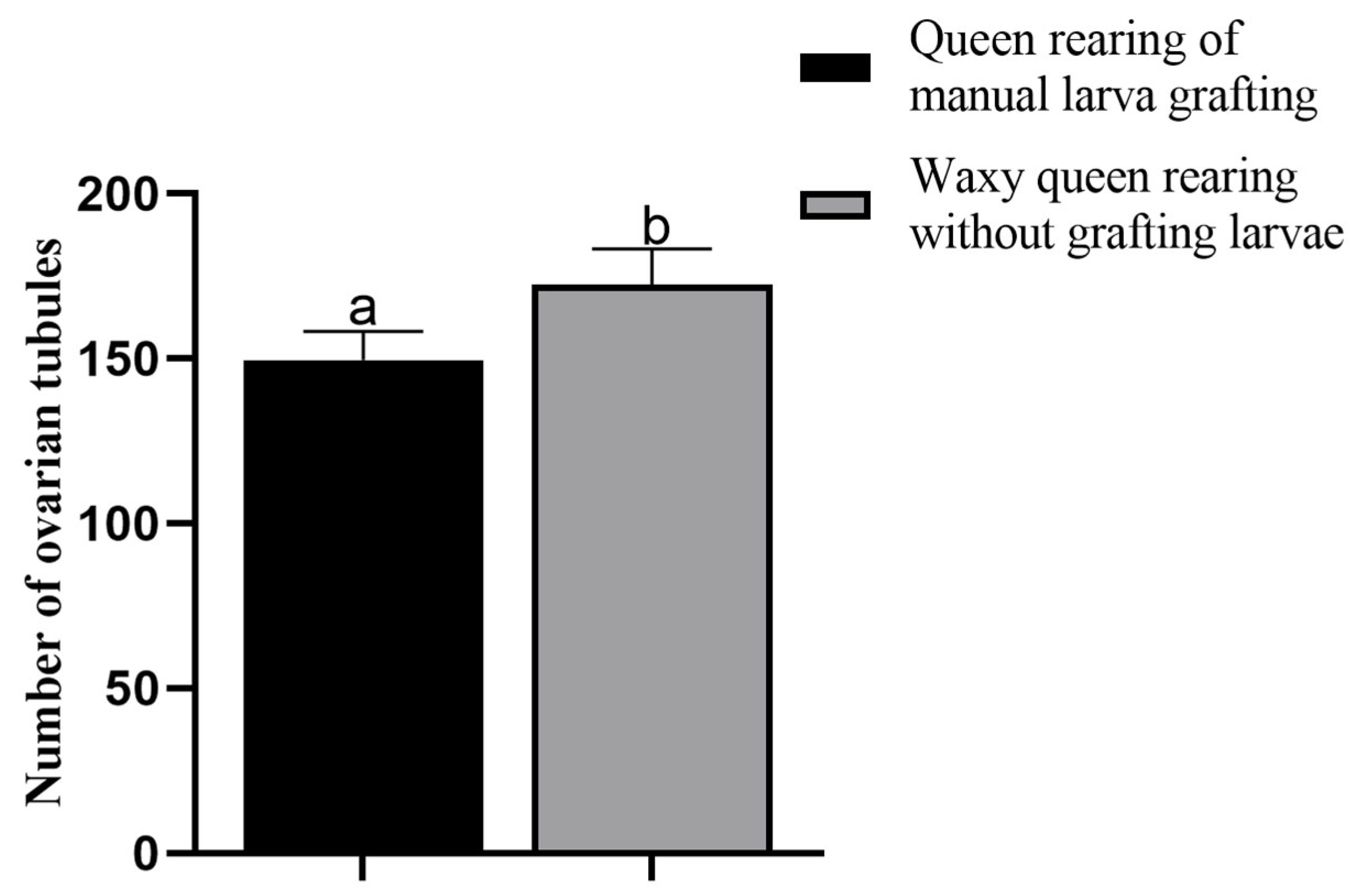 3.5. Comparison of Two Methods on the Number of Ovarian Tubules of Reared Queens