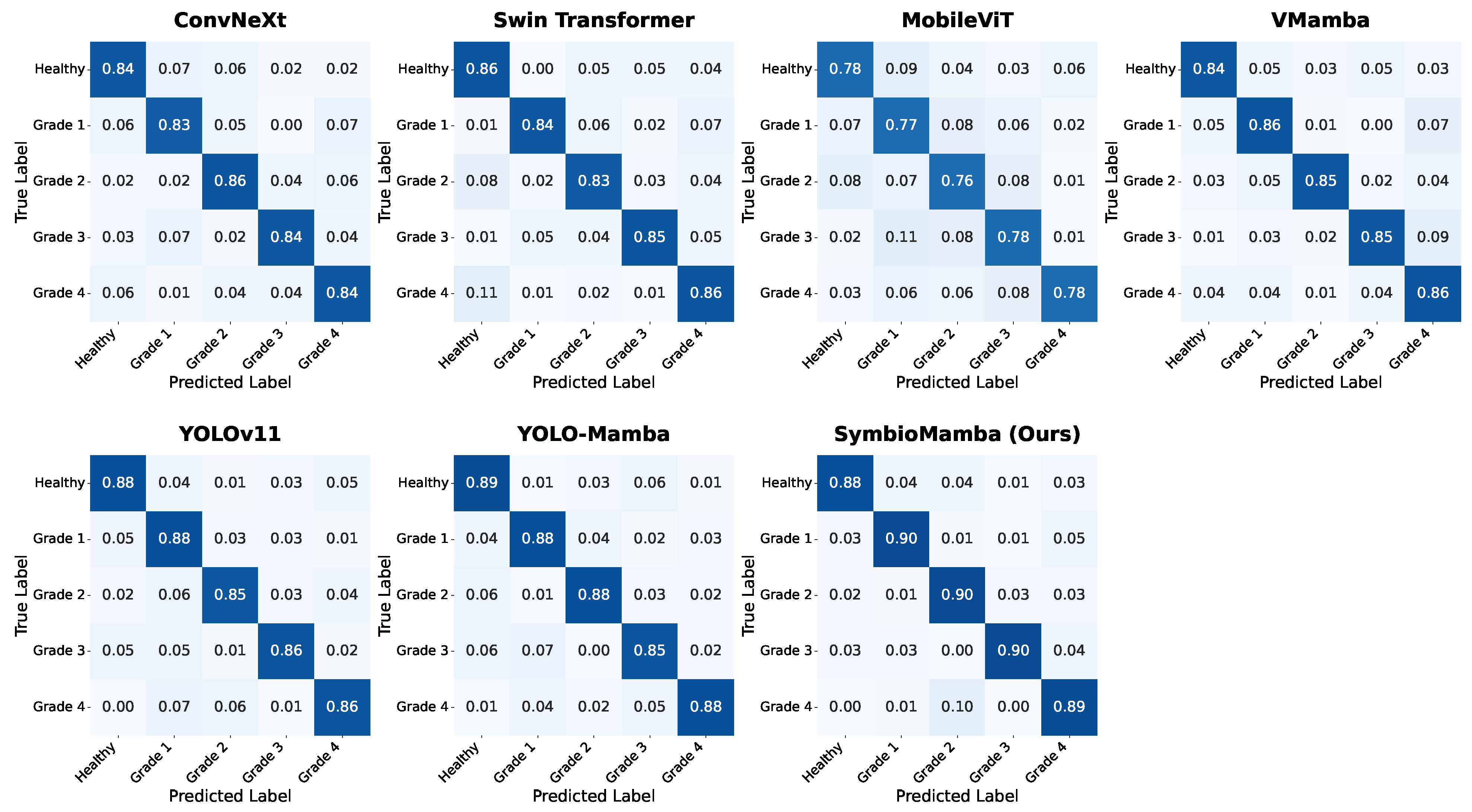 - Task-Specific Agricultural Baselines: YOLOv11 [42] and YOLO-Mamba [43] serve as the primary benchmarks for disease perception, representing high-speed edge detection and contemporary SSM-based detection, respectively. Additionally, AgriTransformer [44] is included as a specialized baseline that utilizes self-attention mechanisms tailored for agricultural scene understanding, allowing us to evaluate SymbioMamba against models specifically optimized for crop phenotypic variations.