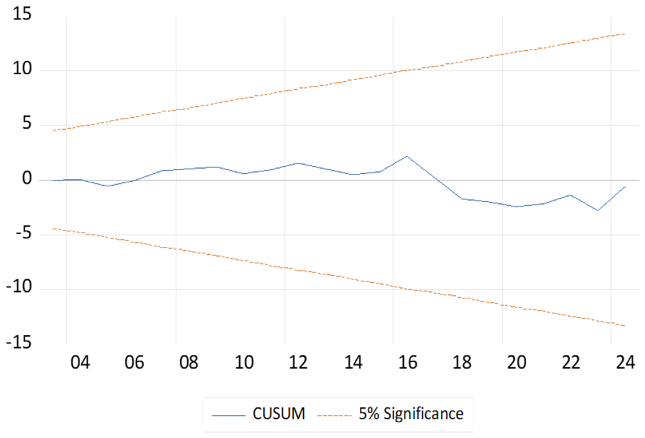 3.8. Validation Checks on the Standard ARDL Versus the Augmented (With Break Dummies) ARDL