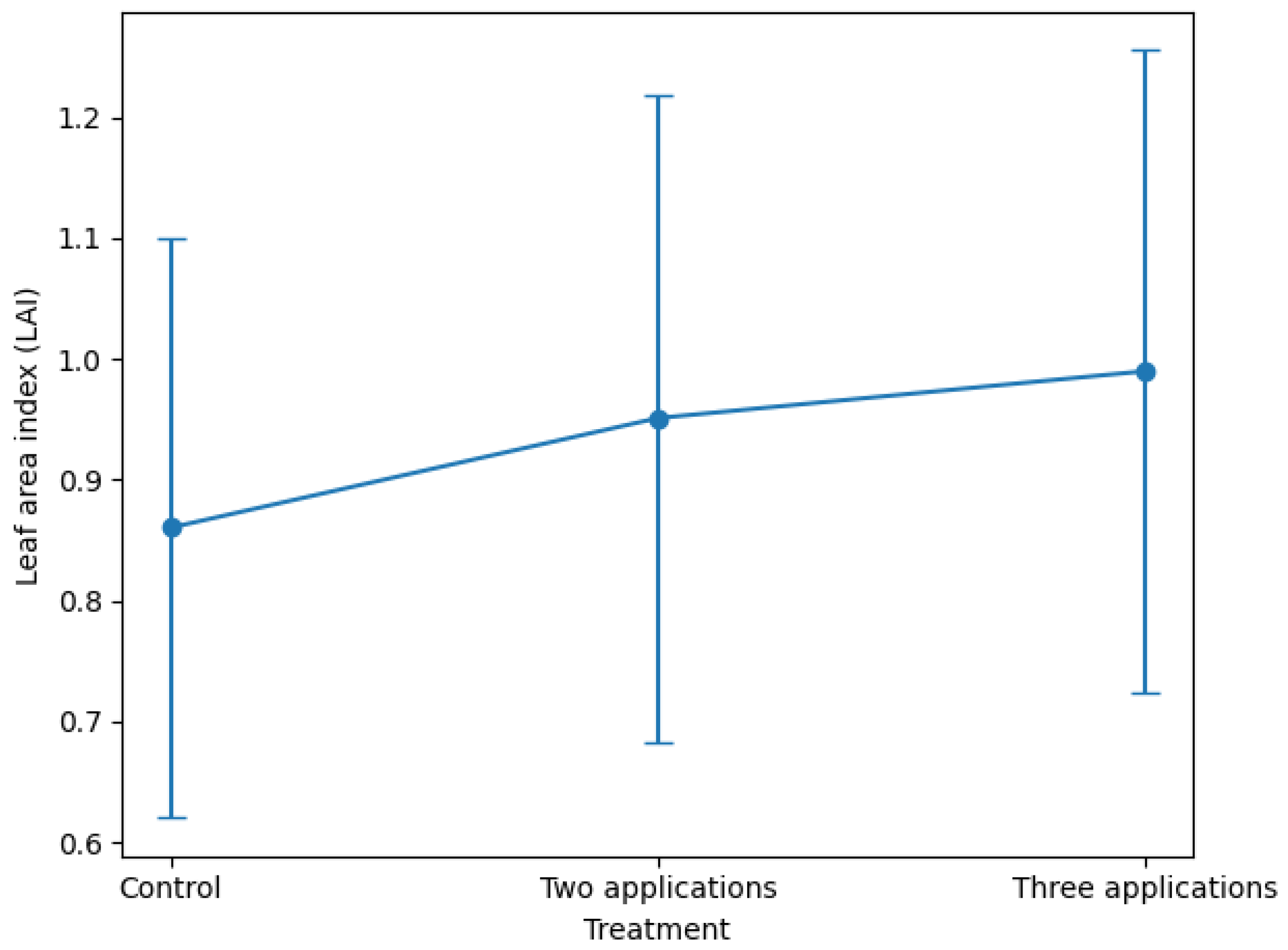 Leaf area index (LAI) varied among biostimulant application strategies (Figure 1). Averaged across cultivars and measurement dates, differences in LAI values were observed among treatments compared to the control, with the highest values recorded under the strategy with three applications.