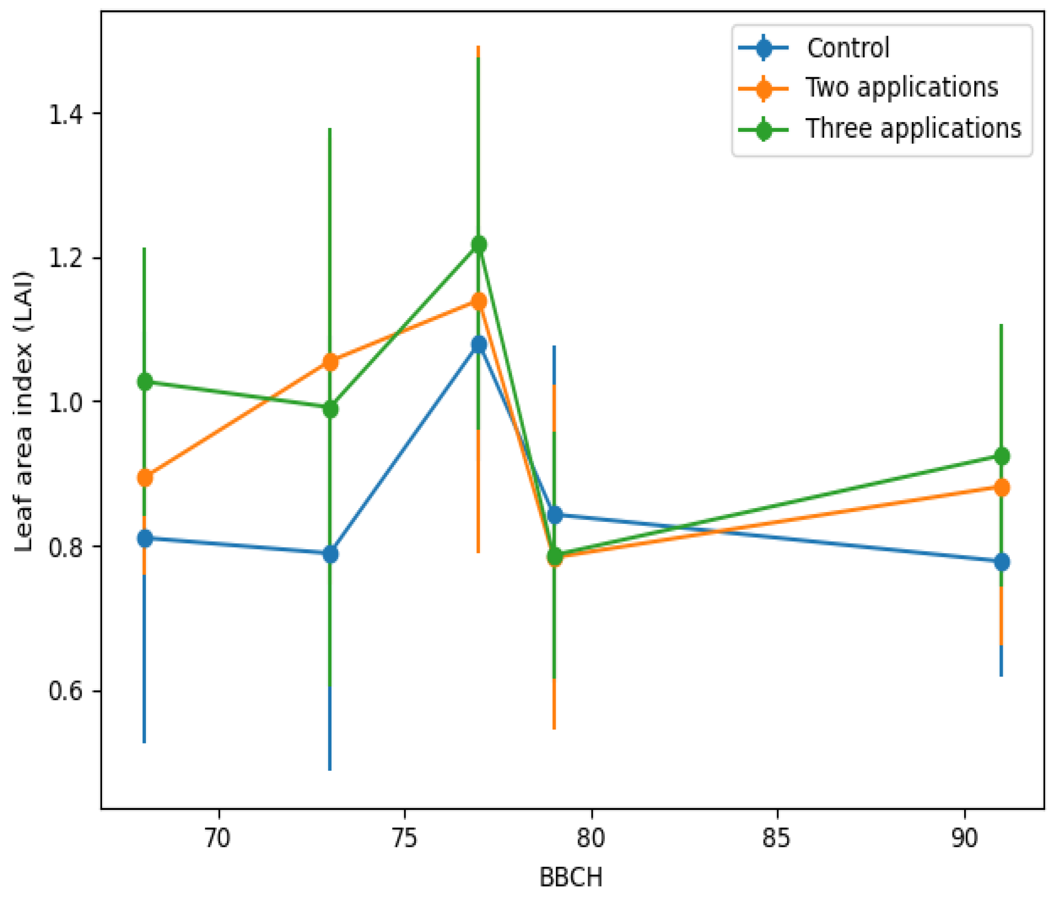 Seasonal changes in leaf area index (LAI) across phenological stages are shown in Figure 2. LAI values varied during the growing season, without significant differences, but differences in LAI values were observed among treatments at several BBCH stages.