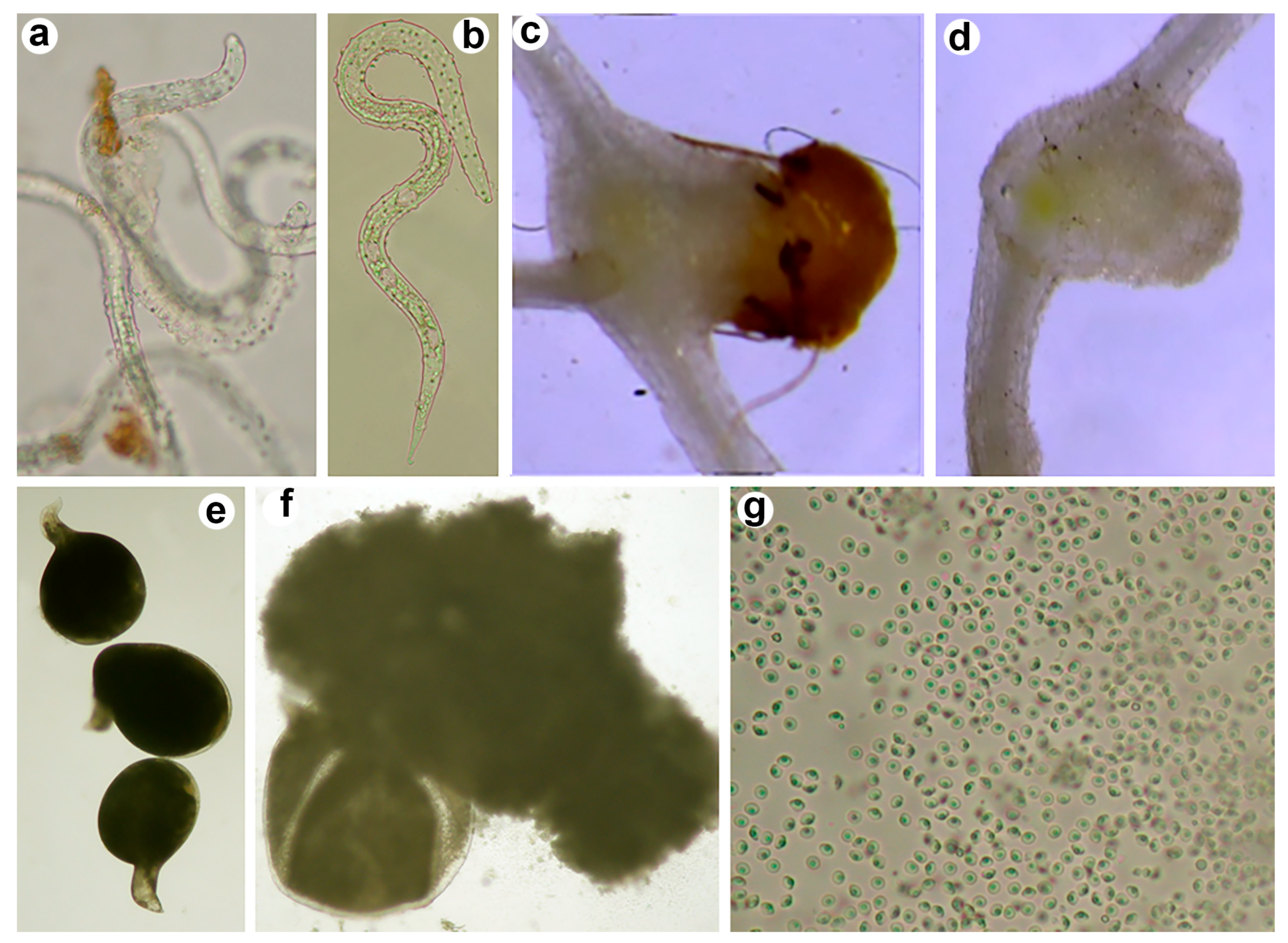 Figure 1. (a,b) Second-stage juveniles of Meloidogyne javanica heavily encumbered with spores of Pasteuria penetrans (Pp3); (c) a root gall with a female of Meloidogyne javanica with the egg mass; (d) a root gall with a female of M. javanica without egg mass due to Pp3 infection; (e) females of M. javanica infected by Pp3; (f) single female of M. javanica releasing spores of Pp3 after being crushed; (g) released free spores of Pp3.