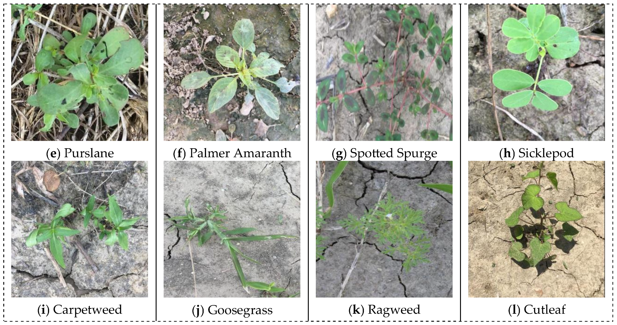 (b) A high-quality cotton field weed dataset has been constructed. Unlike existing datasets based on simple binary classification or laboratory settings, this dataset explicitly classifies 12 weed species, features more realistic complex backgrounds, and demonstrates robust performance in dense weed growth. It provides a foundation for evaluating the robustness and fine-grained classification capabilities of deep learning-based detection models.