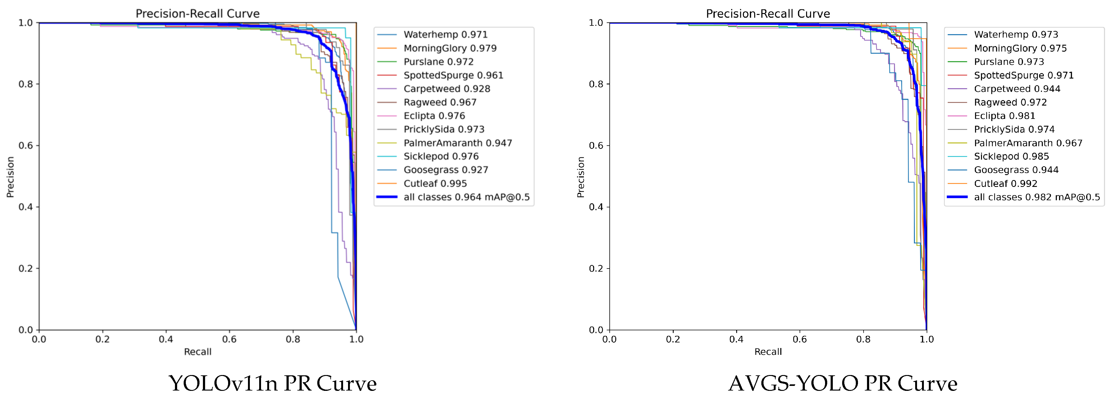 A comparison of the precision–recall curves for the original YOLOv11n and improved AVGS-YOLO models (