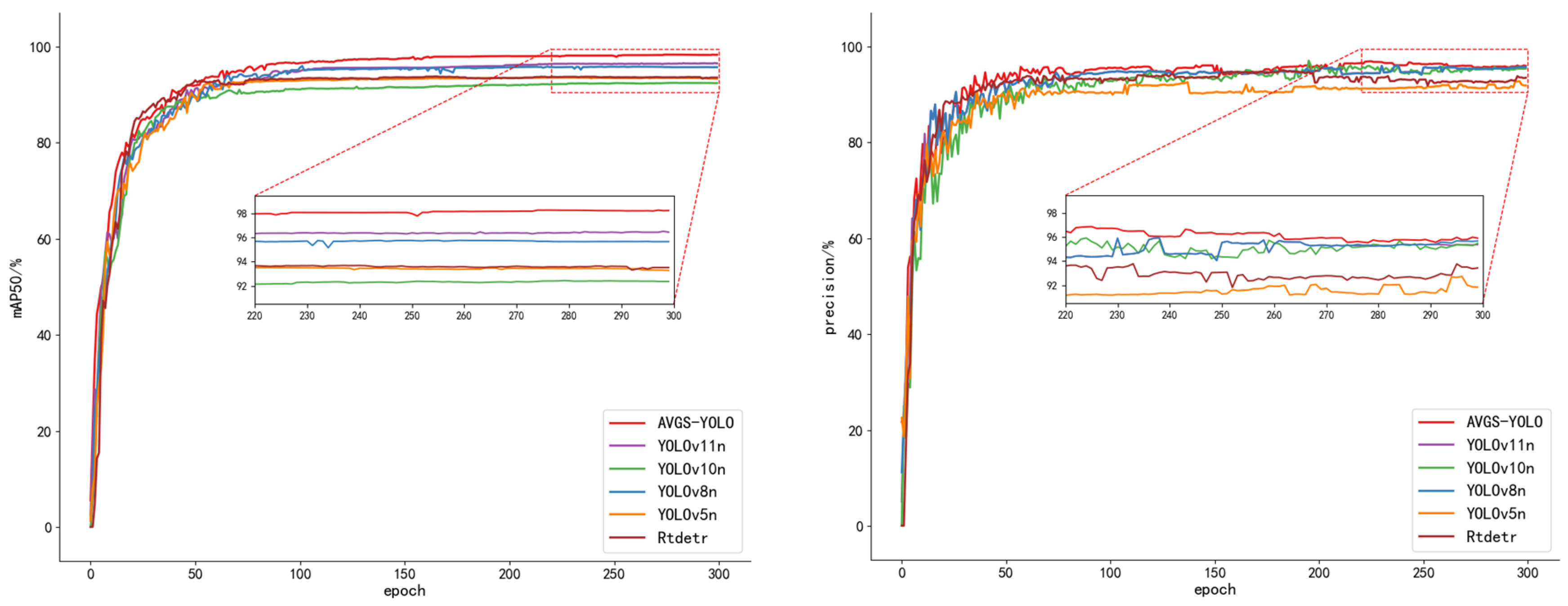 Figure 15. For all models, both precision and mAP50 metrics increase rapidly within the first 100 epochs and then plateau. By comparing the training trajectories of the improved network with other classic networks, it is evident that in terms of the core evaluation metrics of precision and mAP50 for object detection tasks, the AVGS-YOLO model outperforms mainstream algorithms such as RT-DERT, YOLOv5n, YOLOv8n, YOLOv10n, and YOLOv11n.