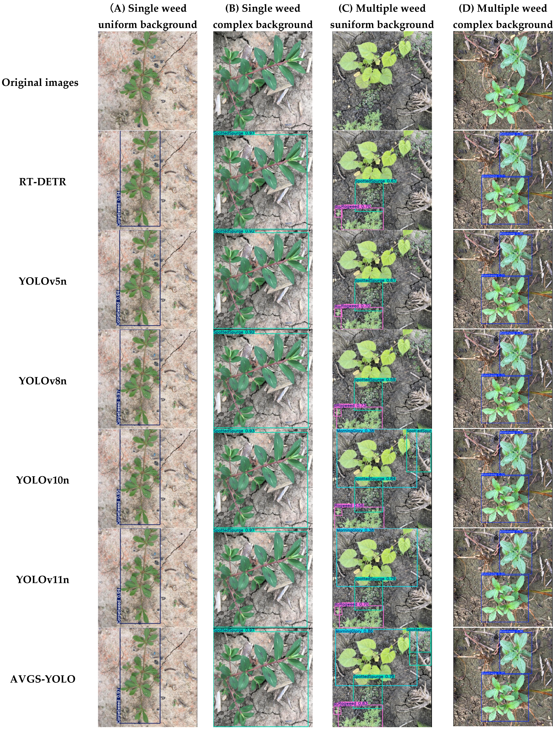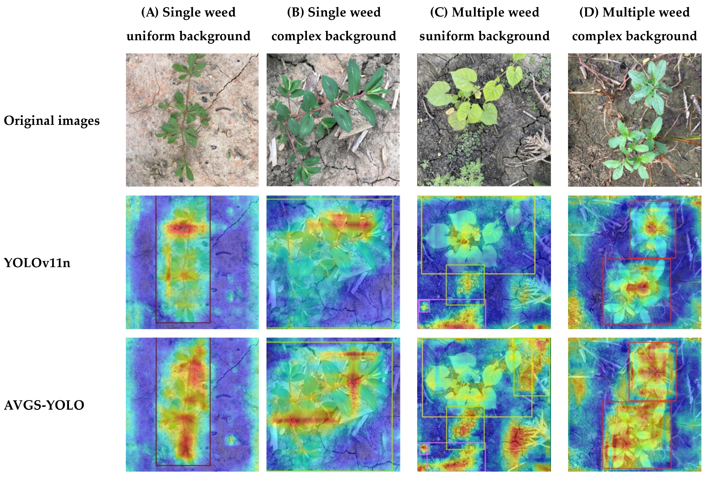 Figure 17 validate the quantitative metrics, further revealing the AVGS-YOLO model’s exceptional discriminative ability when handling complex challenges such as high occlusion rates and strong inter-class similarity. Specifically, the AVGS-YOLO model demonstrated excellent robustness, effectively mitigating interference from soil cracks and overcoming the risk of false detections caused by withered weeds.