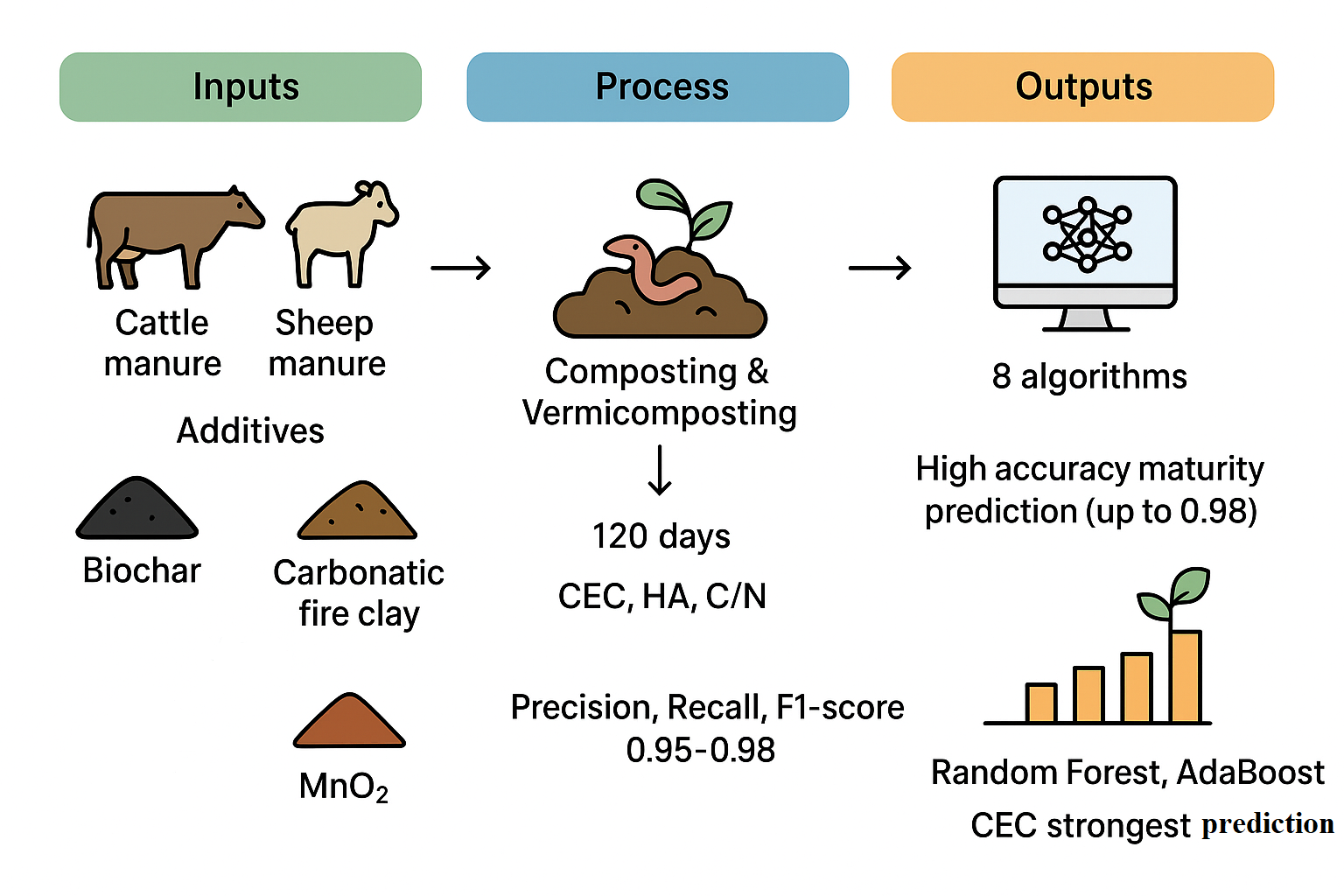 | [10] | Compost Maturity (GI, OM) | Time, Organic Matter, Humification Index | Random Forest, SVM | Time and humification indexes critical; RF and SVM provide best accuracy for maturity prediction |