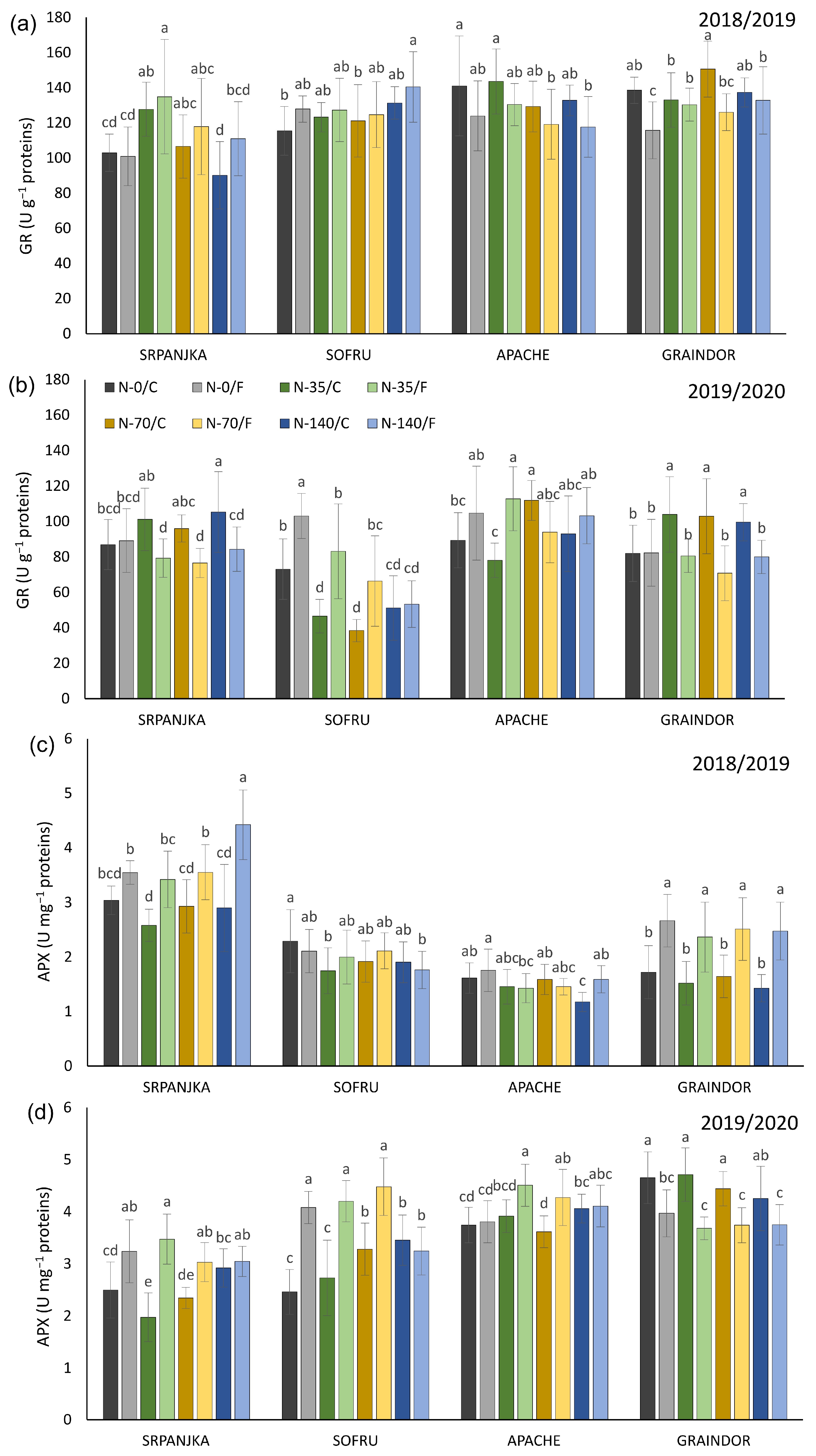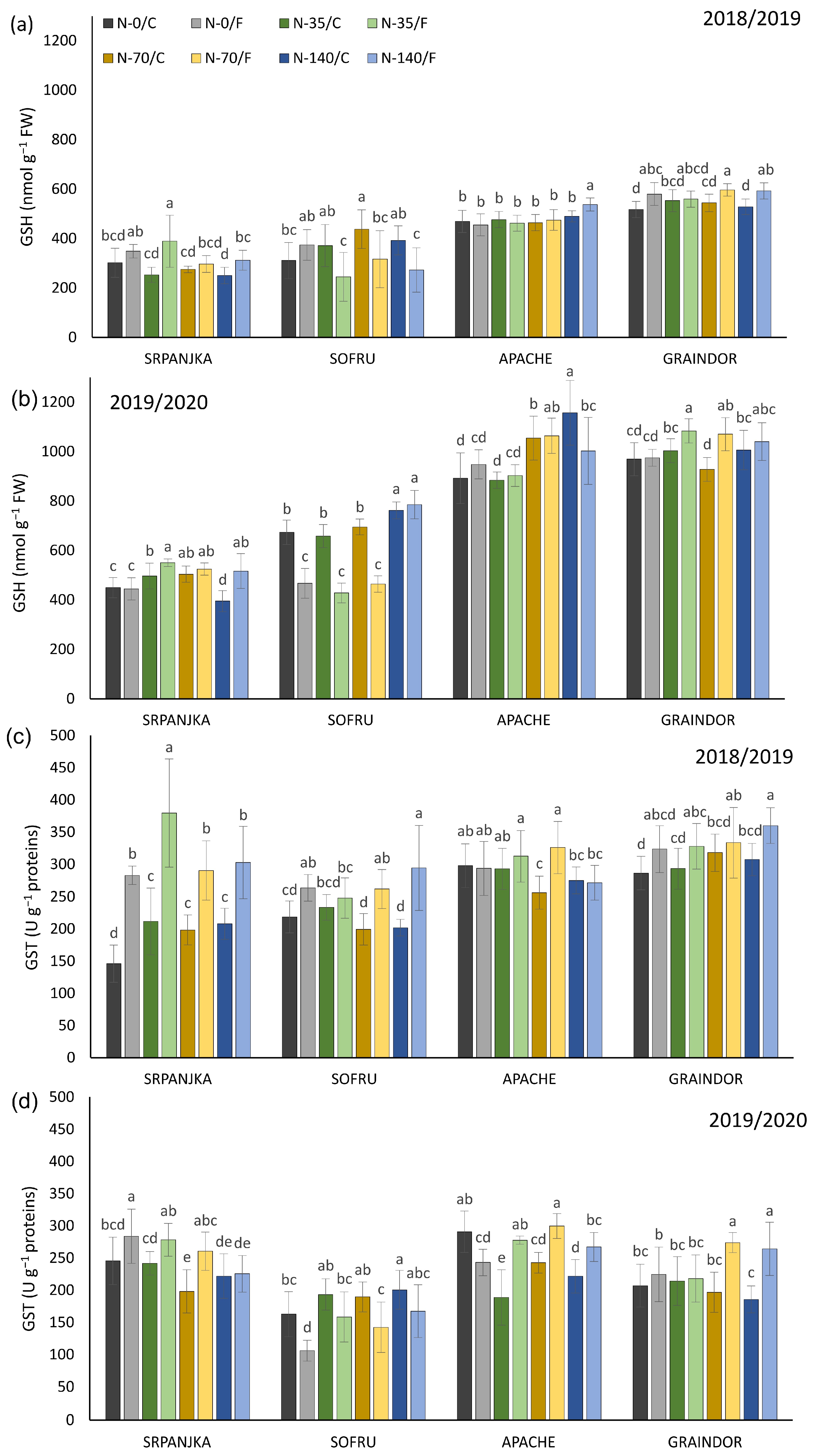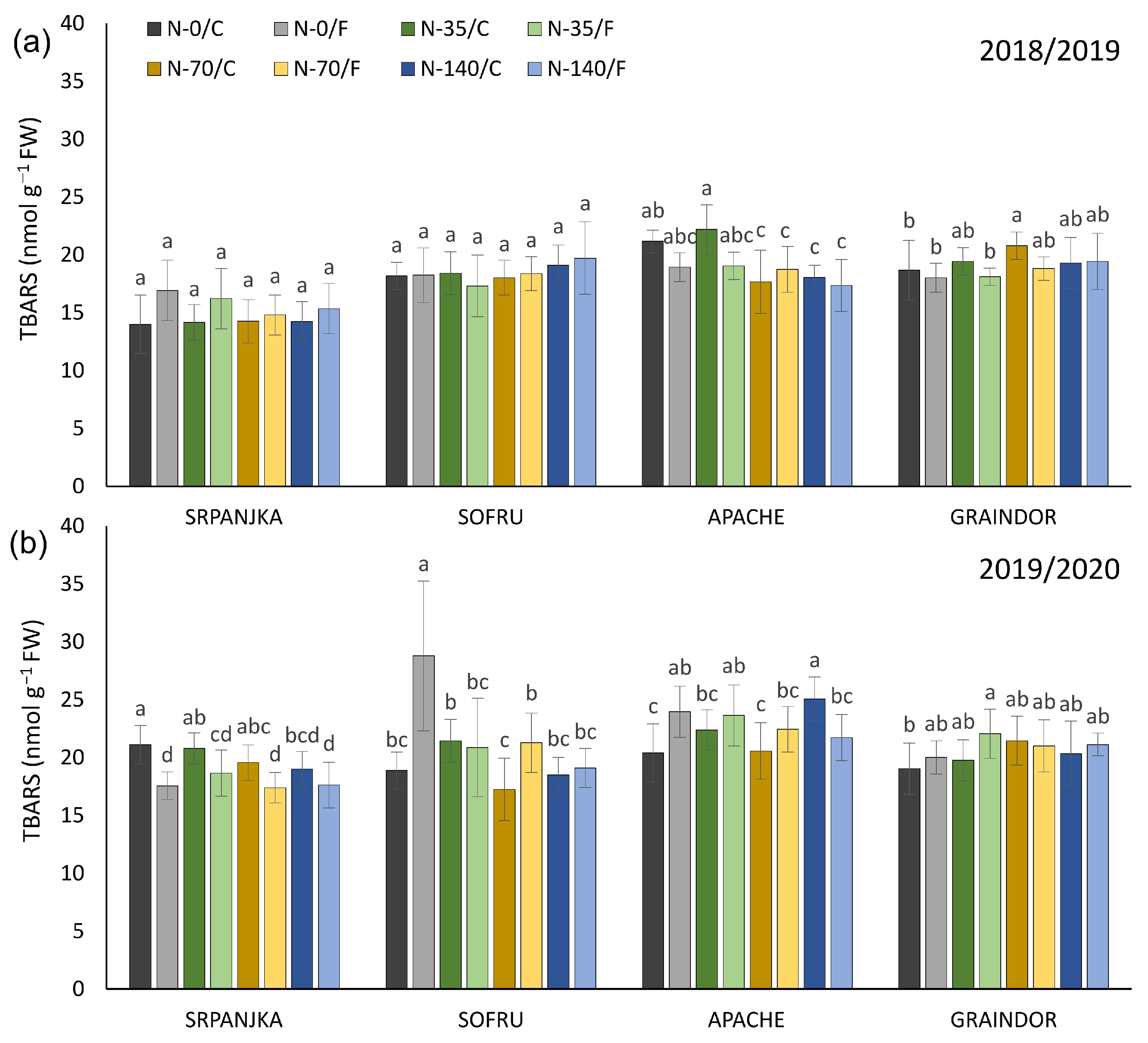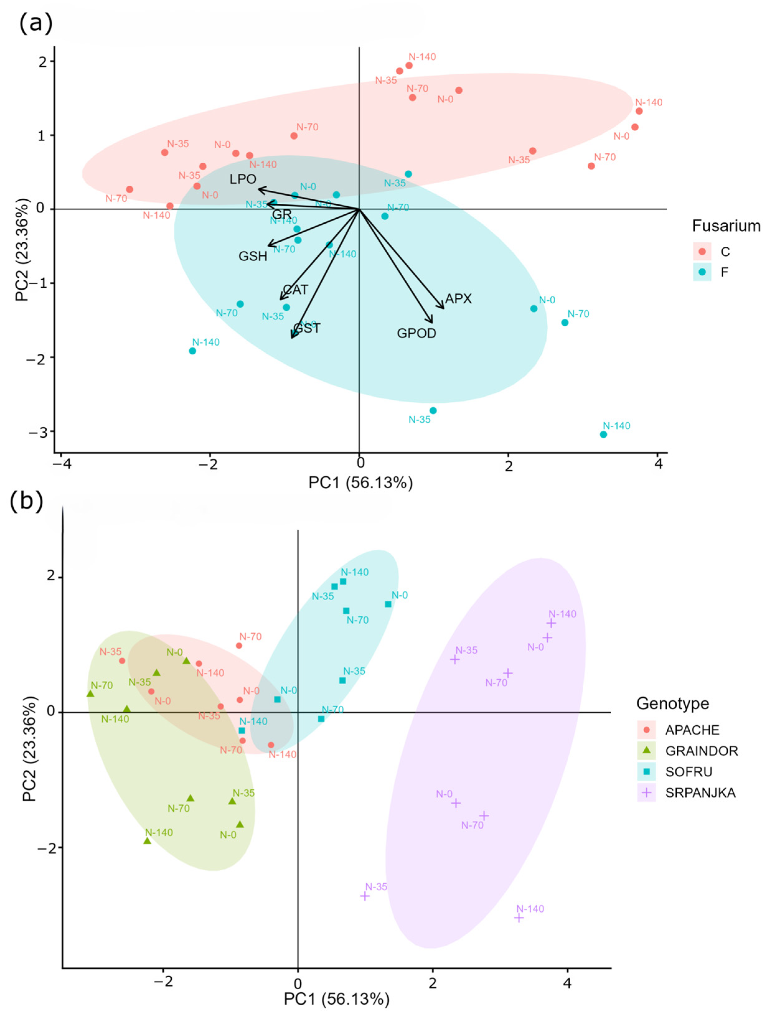 - Matić, M.; Vuković, R.; Vrandečić, K.; Štolfa Čamagajevac, I.; Ćosić, J.; Vuković, A.; Sabljić, K.; Sabo, N.; Dvojković, K.; Novoselović, D. Oxidative status and antioxidative response to Fusarium attack and different nitrogen levels in winter wheat varieties. Plants 2021, 10, 611. [Google Scholar] [CrossRef]