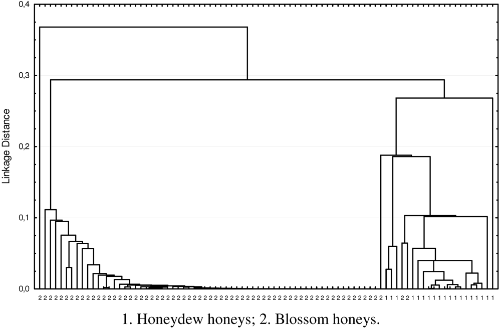 Some physicochemical parameters indicate the presence of honeydew in honey, as is the case for the electrical conductivity. European legislation has established a minimum of 0.800 mS/cm for honeydew honeys, chestnut honeys and their blends. Only 18.6% (16 samples) of the studied honeys had higher electrical conductivity and all of them show a significant amount of Castanea pollen in the pollen spectra (6 samples more than 70%). In general, dark honeys had the highest mineral content [27,28], nevertheless Erica honeys and Castanea honeys frequently have similar mineral content to honeydew honeys [29]. Another physicochemical parameter used for honey typification was colour; dark honeys or amber dark honeys were frequently associated with honeydew but as occurs with electrical conductivity, Castanea honeys or Erica honeys, among others, have dark or amber dark colour. Related to sensorial attributes honeydew honeys were described by González et al. [30] as dark caramelized liquid honeys, without crystallization, of intense fruitiness with certain floral notes, spicy with a woody fresh odor and very greasy in the mouth. Again nectar contributions of Castanea could confuse the origin of honeys by their sensorial perceptions since this type of honey has woody olfactory perceptions but with strong intensity [29].