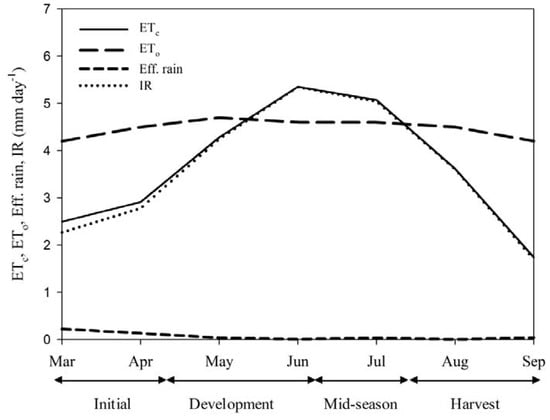 Daily crop evapotranspiration (ETc), reference evapotranspiration (ETo), effective rainfall (Eff. Rain) and basic irrigation requirements (IR) of jatropha in the reference climate during one growing period (March–September).