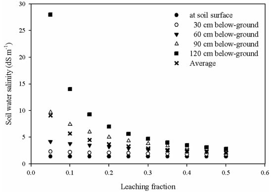 Simulated average soil water salinity (expressed as electrical conductivity) at the soil surface, 30 cm, 60 cm, 90 cm and 120 cm below ground and average root-zone salinity resulting from different leaching fractions.