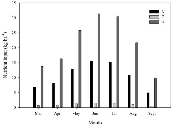 Total mineral N (Nmin), mineral P (PO4-P) and (K) increased from 80 to 151, from 7 to 14 and from 160 to 304 kg ha−1, respectively, with an increasing LF from 0.05 to 0.5 (Table 3). With minimum leaching factor (0.00), nutrient load corresponded to 76kg N ha−1, 7 kg P ha−1 and 152 kg K ha−1 during the growing season. In detail, nutrient delivery from the effluent was highest in June, with an N, P and K input of 16, 1 and 31 kg ha−1, respectively. Until September, it decreased constantly to a monthly input of 5 kg N ha−1, 0.5 kg P ha−1 and 10 kg K ha−1 (Figure 3).