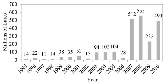 Canadian ethyl alcohol imports in millions of litres, 1995–2010 [21].
