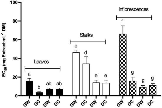 | Phenolic content (mg/g Cc DM) | EC50 Reducing capacity (mg/mL DM) | EC50 DPPH scavenging activity (mg/mL DM) | |||