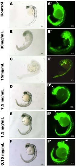 - Kimmel, C.B.; Ballard, W.W.; Kimmel, S.R.; Ullmann, B.; Schilling, T.F. Stages of embryonic development of the zebrafish. Dev. Dyn. 1995, 203, 253–310. [Google Scholar] [CrossRef]