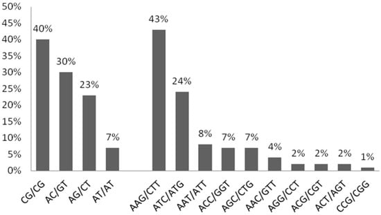 In the di-nucleotide repeat category, the distribution of SSRs in different motif types was not uniform, and the most frequent motif type was represented by CG/GC (40%) and AC/GT (30%), followed by AG/CT and AT/AT (Figure 1). By contrast, the CG/GC motif was reported as the least frequent dinucleotide in dicots []. This difference may account for different genomes being tested or the use of different SSR isolation strategies with varying affinities []. AT repeats were least unlike other reports on the abundance of AT repeats in plant genomes []. The high frequency of CG repeats can be ascribed to the high level of heterochromatin present in Plantago species []. SSR markers with a GC-rich motif would show higher polymorphism than SSR markers with other dinucleotide motifs []. Moreover, taxon-specific accumulation of repeats in eukaryotic genomes has been reported for several species []. It can be inferred that the accumulation of CG repeat can be species specific.