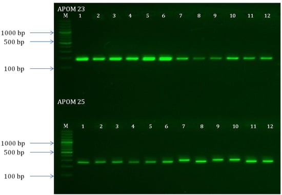 Out of the selected 37 primers, 30 showed amplification and generated a total of 32 amplicons in Plantago ovata. Hence, the overall amplification rate was high (81%) without any non-specific amplification. The amplicon length ranged from 126 bp (APOM24) to 715 bp (APOM20). All microsatellites genotyped amplified alleles within the expected size range. However, only one or two alleles were observed at each one of the 30 SSRs (Table 4). All microsatellites were monomorphic, displaying a single allele in the P. ovata accessions (Figure 2) analyzed in spite of the expected multiallelic nature of these hypervariable markers. The results of the microsatellite analysis in P. ovata are well in line with other studies that dealt with RAPD and ISSR [,]. The narrow variation and lack of inherent genetic diversity among the different P. ovata genotypes has also been revealed by both RAPD and ISSR markers [,]. Another important result rendered by the microsatellite analysis is a very high rate of homozygosity in contrast to the preferentially outcrossing mating system for P. ovata. As a protogynous species with a temporal difference in anthesis, it is expected that most loci in P. ovata would be heterozygous, due to the preferential occurrence of outcrossing.
