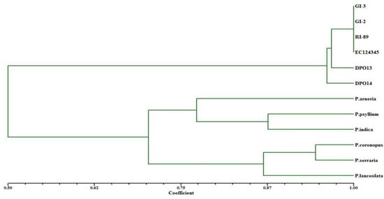 Jaccard’s similarity coefficients among all pair-wise combinations of genotypes ranged from 0.38 to one, with a mean genetic similarity of 0.68. The dendrogram based on UPGMA analysis separated all of the genotypes into six groups at an average cut-off value of 0.79 (Figure 3). Six genotypes of Plantago ovata clustered into group one, and the rest of the genotypes were clustered in the other two. The first major cluster was divided into two minor clusters, out of which one minor cluster had one of the two early maturing genotypes, DPO14 of P. ovata having 94% similarity between them. Cluster I with only P. ovata was further sub-clustered, comprising GI-3, GI-2, RI-89 and EC124345 with 98.6% similarity. The accession EC123345 is highly resistant to downy mildew and is indigenous to Pakistan, hence being very distinct. However, this could not be clearly detected by SSR. Cluster II was comprised of P. arenaria, P. psyllium and P. indica; Cluster III was comprised of P. coronopus, P. serraria and P. lanceolata. The clustering pattern of the dendrogram corroborates the nature of genotypes GI-3, GI-2 and RI-89, which are developed by mutation breeding and possess elite characteristics, such as the EC124345 line, which is downy mildew resistant. The pattern of clustering of other species corresponds with earlier studies of []. In the second cluster, P. arneria alone showed a similarity index of about 63% and 78% with P. psyllium and P. indica, respectively. The placement of P. serraria and P. lanceolata in the present dendrogram does not line up with earlier findings [], as both of these species belong to different subgenus’s, coronopus and albicans, respectively; hence P. serraria should have been therefore clustered with species in the fourth cluster.