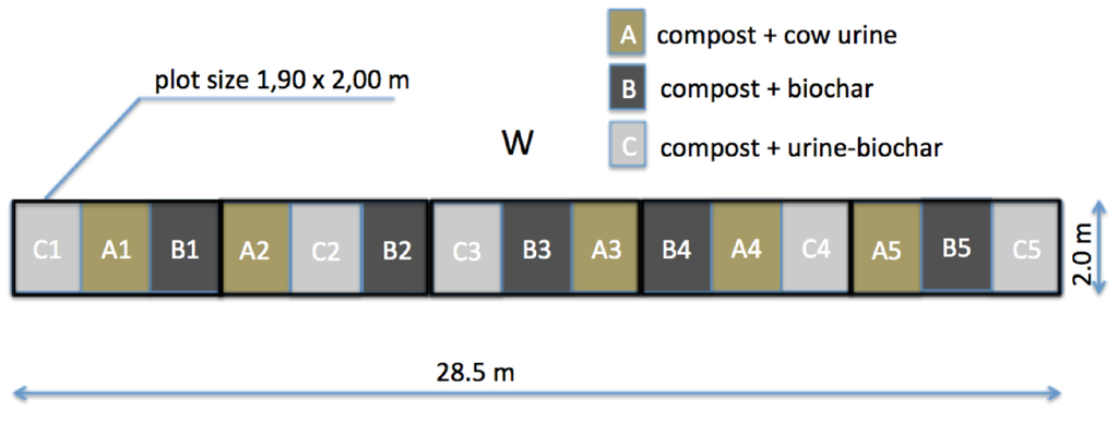 The three treatments were: (A) 10.5 t·ha−1 compost + 6.3 m3·ha−1 cow urine (referred to hereafter as “urine-only”); (B) 10.5 t·ha−1 compost mixed with 0.75 t·ha−1 (dry matter (DM)) biochar without cow urine (referred to hereafter as “biochar-only”); (C) 10.5 t·ha−1 compost + 0.75 t·ha−1 (DM) biochar macerated in 6.3 m3·ha−1 cow urine (referred to hereafter as “urine-biochar”).