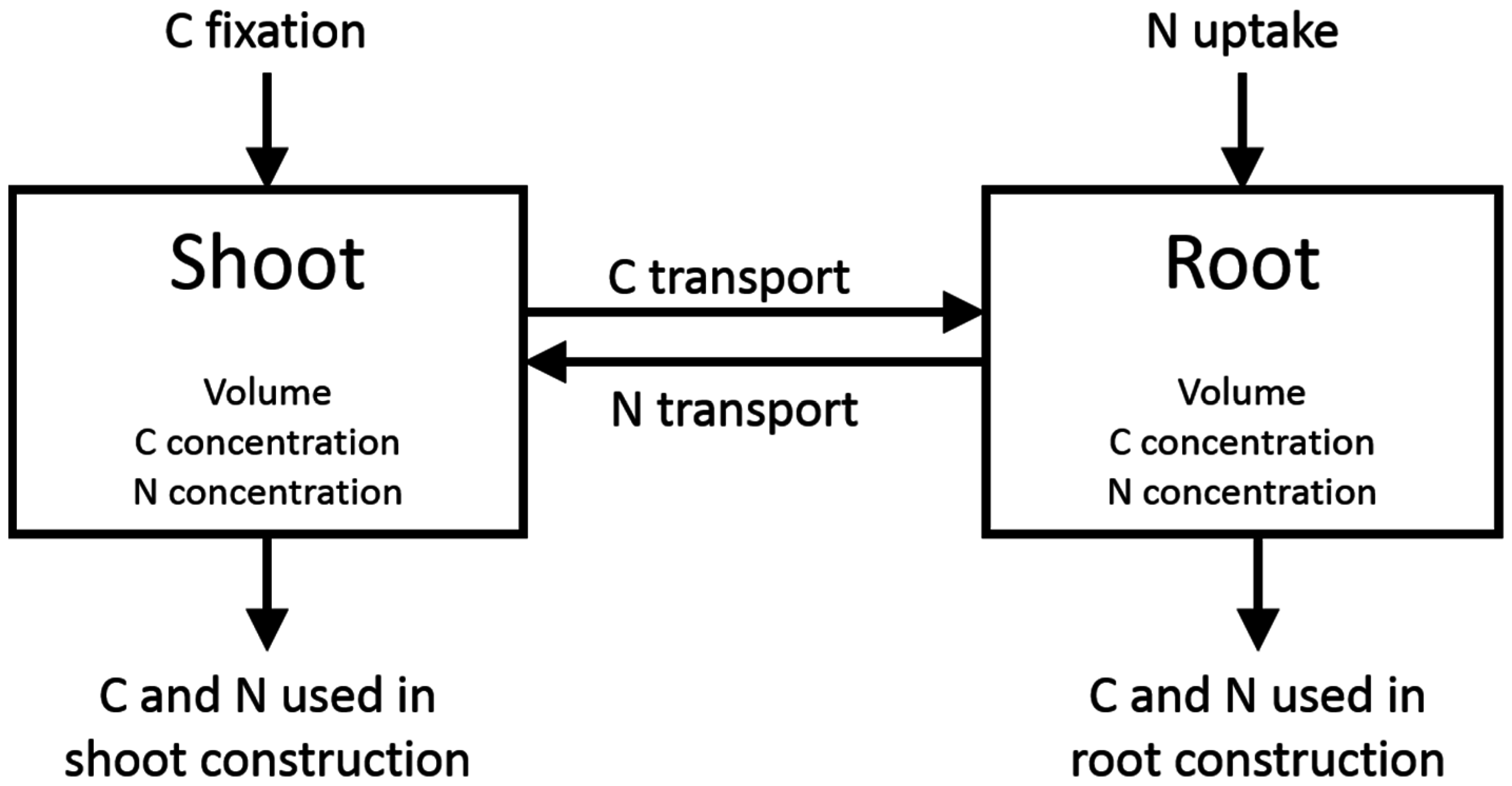 Two pool model of shoot and root growth. C and N status in each pool influences the volume of the pool. Adapted from [8].