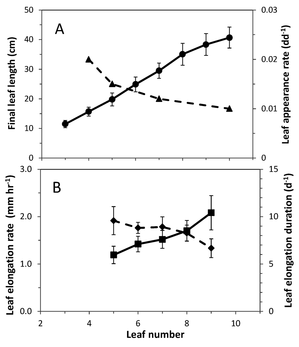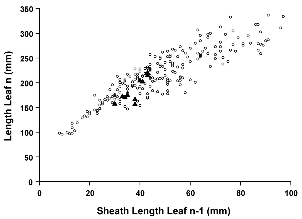 As mentioned earlier, both LAR and LED appear to be correlated with sheath length. It can be emphasized here that a correlation between LAR and LED was also observed under conditions where sheath length was not the primary source of variation [99,104]. This relationship between LAR and LED is probably derived from the principle of growth co-ordination between successive leaves (i.e., coordination of the successive phases of leaf development, from initiation to emergence and achievement of final size) as proposed in [105] or more recently in [106].