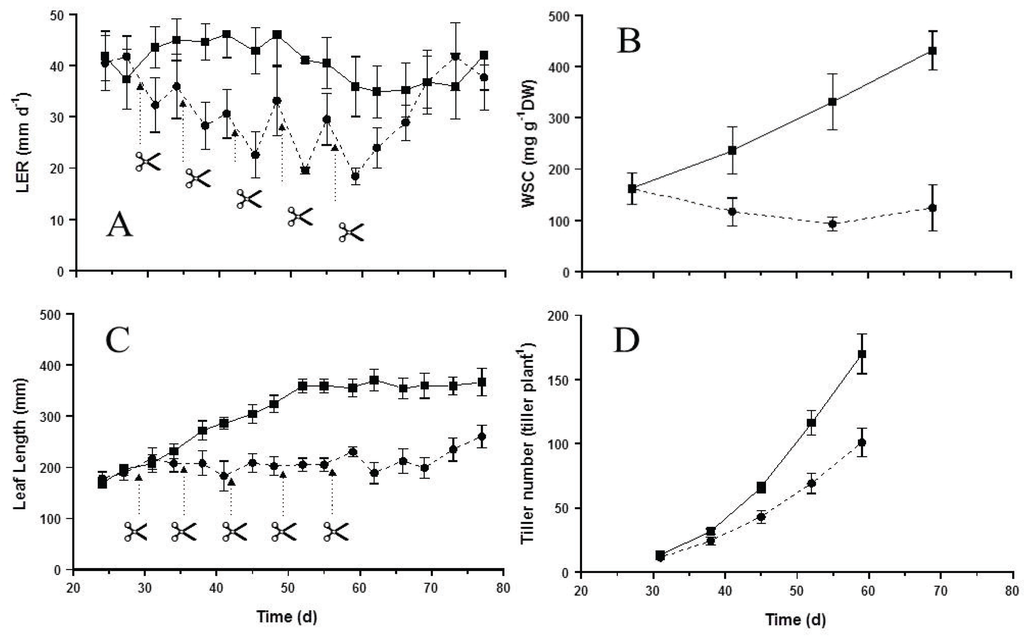 ) applied to ryegrass plants, followed by a lax period allowing leaf growth recovery, on leaf elongation rate per tiller (LER, A),water-soluble carbohydrate concentration (WSC) in the leaf base (B), final leaf length (C) and tiller number per plant (D). ■ Undefoliated control plants; ● defoliated plants; d: day. Arrows indicate timing of the successive defoliations. Plants were grown under constant controlled conditions. Defoliated plants were clipped at a 5-cm stubble height [98].