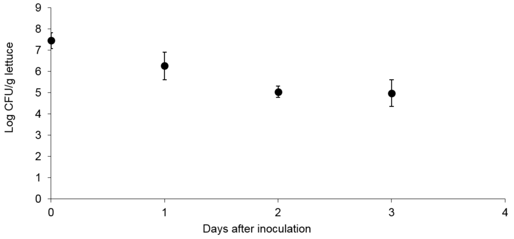 Survival of E. coli O157:H7 Sakai on butterhead lettuce. For each experiment 2 samples were analyzed (n = 2) and the experiment was performed three times.