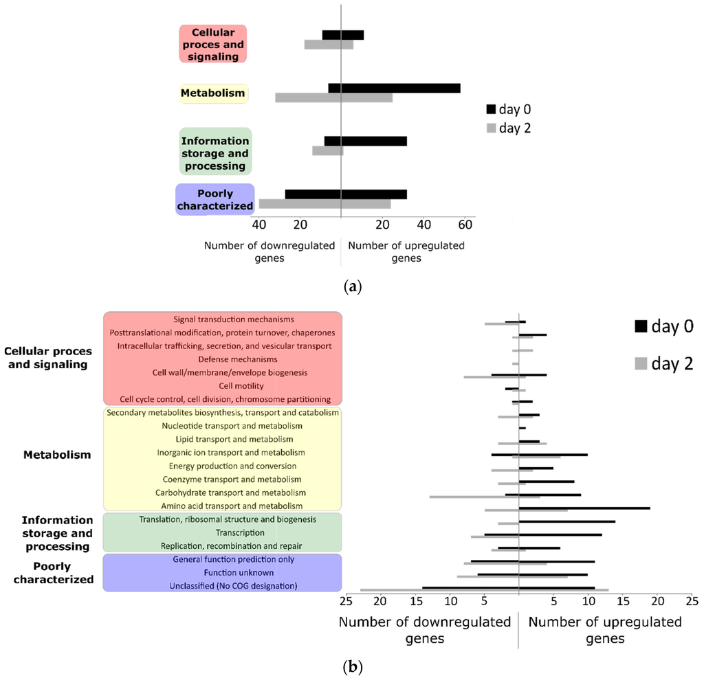Overview of the significantly differentially regulated genes (p < 0.01, at least two-fold, raw value > 50) at 1 hpi (day 0) or 2 dpi (day 2), (a) classified by COG group and (b) COG functional category.