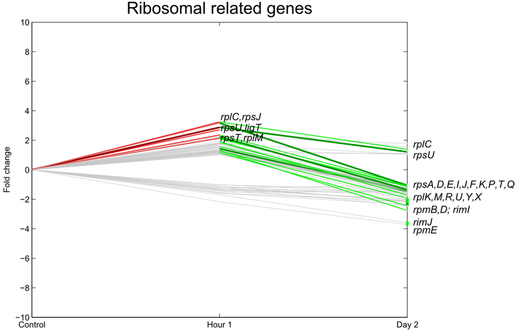 Relative expression of E. coli O157:H7 Sakai ribosomal-related genes one hour and two days after inoculation on lettuce plants. A colored line between the control and hour 1 shows that a particular gene was significantly differently expressed one hour after inoculation on the lettuce in comparison with the inoculum. A colored line between hour 1 and day 2 shows that the gene expression of a particular gene was significantly different between these two time points. Colored dots at day 2 show the genes which were significantly differently expressed on day 2 in comparison with the control. Light green: downregulation at 0.01 ≤ p < 0.05, dark green: downregulation at p < 0.01, light red: upregulation at 0.01 ≤ p < 0.05, dark red: upregulation at p < 0.01. Grey: no significant difference in expression. Data represent the mean of four biological replicates.