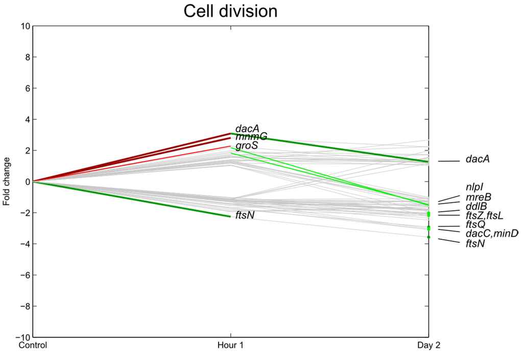 Relative expression of E. coli O157:H7 Sakai genes related with cell division one hour and two days after inoculation on lettuce plants. A colored line between the control and hour 1 shows that a particular gene was significantly differently expressed one hour after inoculation on the lettuce in comparison with the inoculum. A colored line between hour 1 and day 2 shows that the gene expression of a particular gene was significantly different between these two time points. Colored dots at day 2 show the genes which were significantly differently expressed on day 2 in comparison with the control. Light green: downregulation at 0.01 ≤ p < 0.05, dark green: downregulation at p < 0.01, light red: upregulation at 0.01 ≤ p < 0.05, dark red: upregulation at p < 0.01. Grey: no significant difference in expression. Data represent the mean of four biological replicates.