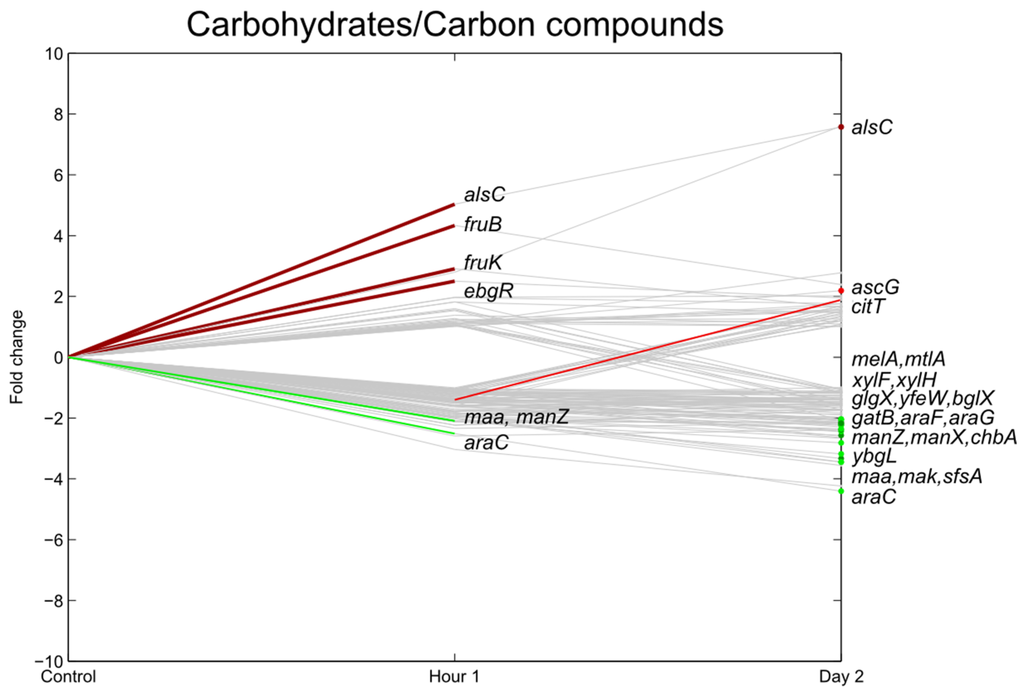 Relative expression of E. coli O157:H7 Sakai genes related with carbohydrate uptake one hour and two days after inoculation on lettuce plants. A colored line between the control and hour 1 shows that a particular gene was significantly differently expressed one hour after inoculation on the lettuce in comparison with the inoculum. A colored line between hour 1 and day 2 shows that the gene expression of a particular gene was significantly different between these two time points. Colored dots at day 2 show the genes which were significantly differently expressed on day 2 in comparison with the control. Light green: downregulation at 0.01 ≤ p < 0.05, dark green: downregulation at p < 0.01, light red: upregulation at 0.01 ≤ p < 0.05, dark red: upregulation at p < 0.01. Grey: no significant difference in expression. Data represent the mean of four biological replicates.