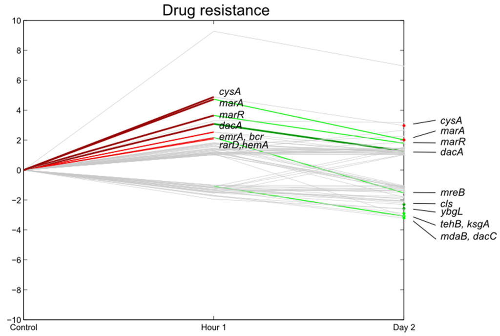 The expression of the stress responsive genes and drug resistance genes is shown in Figure 6 and Figure 7. A stress responsive gene set that was significantly induced at 1 hpi was the iron-sulfur cluster (iscSRUA-hscBA-fdx). These genes are essential for all proteins containing Fe-S clusters which participate in many vital cellular functions such as DNA repair, transcriptional regulation, nucleotide and amine acid biosynthesis and energy metabolism [26]. Two other systems with a similar function, the suf-system (sulfur assimilation) and the csd-system (cysteine sulfinate desulfinase), were not differentially regulated. Expression of the three Fe-S cluster assembly operons is regulated by oxidative stress as Fe-S clusters are very sensitive for active oxygen species and iron limitation [26,27].