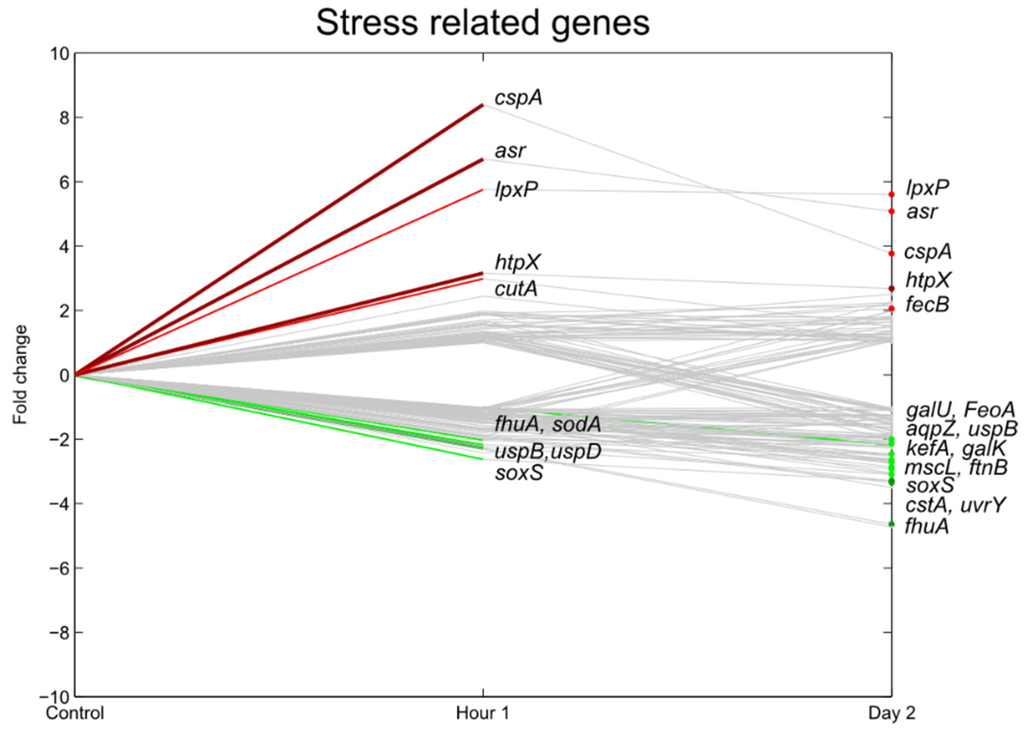Relative expression of E. coli O157:H7 Sakai genes related with stress one hour and two days after inoculation on lettuce plants. A colored line between the control and hour 1 shows that a particular gene was significantly differently expressed one hour after inoculation on the lettuce in comparison with the inoculum. A colored line between hour 1 and day 2 shows that the gene expression of a particular gene was significantly different between these two time points. Colored dots at day 2 show the genes which were significantly differently expressed on day 2 in comparison with the control. Light green: downregulation at 0.01 ≤ p < 0.05, dark green: downregulation at p < 0.01, light red: upregulation at 0.01 ≤ p < 0.05, dark red: upregulation at p < 0.01. Grey: no significant difference in expression. Data represent the mean of four biological replicates.