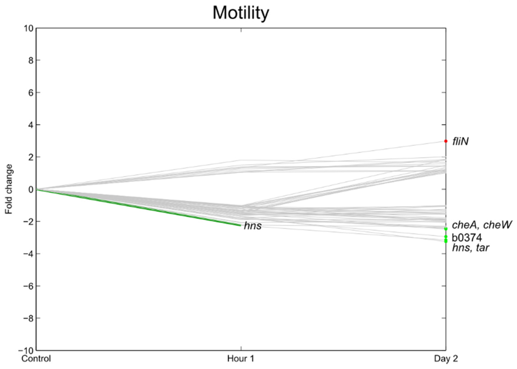 Flagella are cellular appendages involved in the motility of the pathogen and were already related to being involved in the attachment mechanism of pathogenic E. coli to fresh produce [36]. Also, for Salmonella, it was shown that the presence of flagella could increase the attachment capacity of the bacterium to plant tissue for some strains [24,37]. Furthermore, it was also shown that a mutant flagella-deficient Salmonella strain showed reduced internalization into lettuce leaf tissue compared to its wild-type strain [24]. In the present study, only a few genes related to flagella chemotaxis were significantly differentially regulated, with the majority of these genes downregulated (Figure 8 and Figure 9). tar, cheA, cheW, and b0374, were significantly downregulated at 2 dpi. Only fliN, which is responsible for flagellar export, was significantly upregulated at 1 hpi. Taking into account the reduction of cell counts at 2 dpi, these findings are in accordance with the results of Jozefzuc et al. (2010) and Lemuth et al. (2008) who observed downregulation of genes assigned to flagella and motility in response to glucose deprivation and a variety of stress conditions [38,39]. Fink et al. (2012) [4], who investigated the gene expression of E. coli and, did not observe an induction of the flagellar genes (fli operon) for E. coli O157:H7 on detached lettuce leaves. In contrast, Kyle et al. (2010) [3] observed an increase in E. coli O157:H7 fli genes in response to lettuce lysates as compared to growth in M9 medium. In their experiment, however, nutrient replenishment occurred (macerated leaves). This indicates that the influence of postharvest practices (e.g., presence of lettuce lysate due to wounding, e.g., in fresh-cut produce) can have a totally different influence on the gene expression of the pathogen.