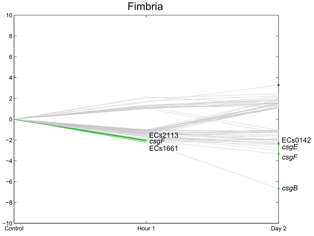 Relative expression of E. coli O157:H7 Sakai genes related with fimbria one hour and two days after inoculation on lettuce plants. A colored line between the control and hour 1 shows that a particular gene was significantly differently expressed one hour after inoculation on the lettuce in comparison with the inoculum. A colored line between hour 1 and day 2 shows that the gene expression of a particular gene was significantly different between these two time points. Colored dots at day 2 show the genes which were significantly differently expressed on day 2 in comparison with the control. Light green: downregulation at 0.01 ≤ p < 0.05, dark green: downregulation at p < 0.01, light red: upregulation at 0.01 ≤ p < 0.05, dark red: upregulation at p < 0.01. Grey: no significant differences in expression. Data represent the mean of four biological replicates.