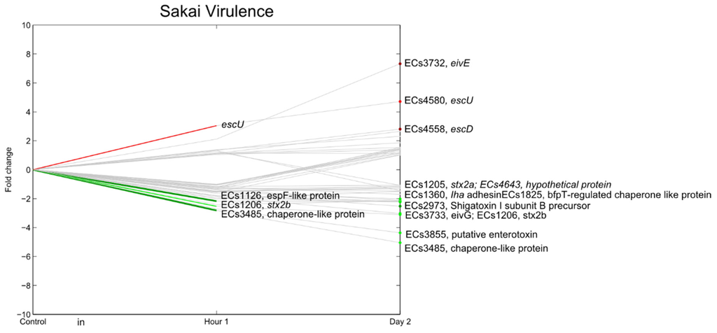 The type III secretion system (T3SS) encoded by the LEE locus is responsible for the formation of attaching and effacing (A/E) lesions. ler (LEE encoded regulator, ECs4588), a central regulator for the genes encoded on the LEE locus [49], was repressed during the experiments and, consequently, most T3SS-related genes were downregulated (Figure 10). Some T3SS genes, however, were significantly upregulated, including ECs3732 (eivE), ECs4558 (escD) and ECs4580 (escU).